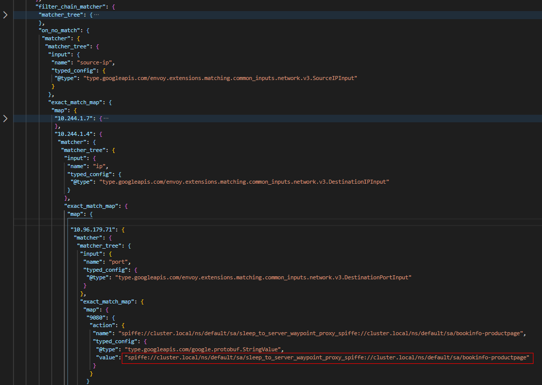 ztunnel_outbound监听器如何选择合适的FilterChain处理流量的呢?如下图所示,ztunnel_outbound监听器中设置了filter_chain_matcher。其中通过匹配数据包的源IP(10.244.1.4,即sleep容器的地址)、目的IP(10.96.179.71,即produtpage服务的ClusterIP)及目的端口(9080即productpage服务端口号),可以选择名称为"spiffe://cluster.local/ns/default/sa/sleep_to_server_waypoint_proxy_spiffe://cluster.local/ns/default/sa/bookinfo-productpage"的FilterChain来处理Sleep发往Productpage的请求。