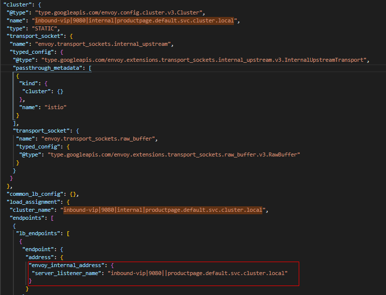 (2) ”inbound-vip|9080|internal|productpage.default.svc.cluster.local” Cluster是一个内部静态类型Cluster,其主要是将流量递交给内部VIP监听器”inbound-vip|9080||productpage.default.svc.cluster.local”,不做其他额外的处理。