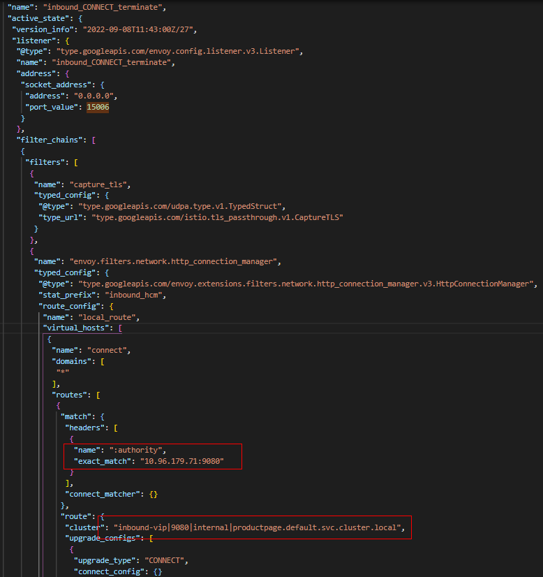 (1) Waypoint首先通过”inbound_CONNECT_terminate”监听器接收Sleep访问Productpage的请求。此监听器上面配置有DownstreamTlsContext,其负责对下游请求进行TLS终止。另外此监听器只有一个FilterChain,包含用于处理HTTP请求的HTTP Connection Manager过滤器。它的核心思想是通过匹配Authority(10.96.179.71:9080,也是原始目的地址)以及CONNECT请求方法进行路由,匹配成功后,选择”inbound-vip|9080|internal|productpage.default.svc.cluster.local” 的 Cluster进行处理。
