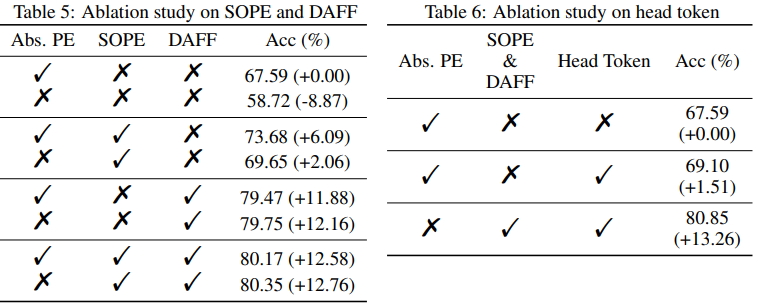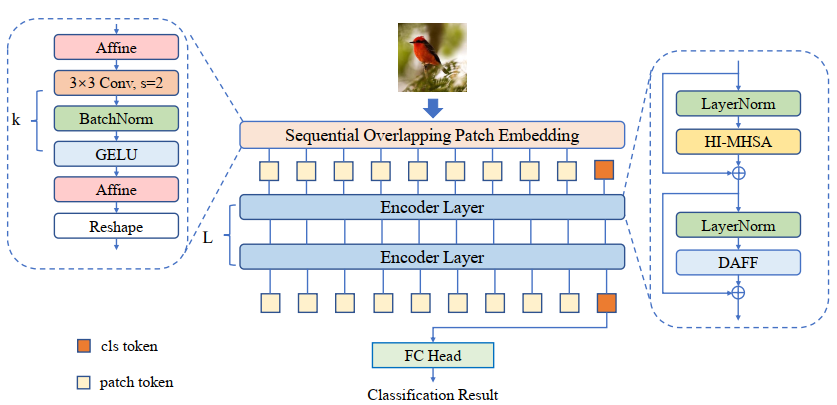 (1)算法主框架:如图1所示,本文采用的是非金字塔型的Transformer结构,并使用class token进行分类。每个编码器层包含一个头交互的多头注意力 (Head-Interacted Multi-Head Self-Attention, HI-MHSA) 以及一个动态聚合前馈神经网络 (Dynamic Aggregation Feed Forward, DAFF). 在patch embedding部分采用了连续重叠的块嵌入模块 (Sequential Overlapped Patch Embedding, SOPE)。网络将最后一层输出的class token送入到线性分类头进行最后的识别。