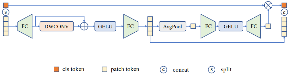 (3)动态聚合前馈神经网络DAFF:本文的在原版的前馈神经网络基础上进行改进,在两个线性层之间加入了深度卷积来进行领域信息的捕捉,弥补了ViT在空间上归纳偏置的不足。同时本文在卷积旁路采用了shortcut连接,维持了原有的全局信息。由于class token无法参与卷积计算,同时又希望对class token进行信息增强,因此作者引入了类似于通道注意力的操作,将卷积后的patch token进行全局平均池化与非线性映射,再逐通道对class token进行加权。