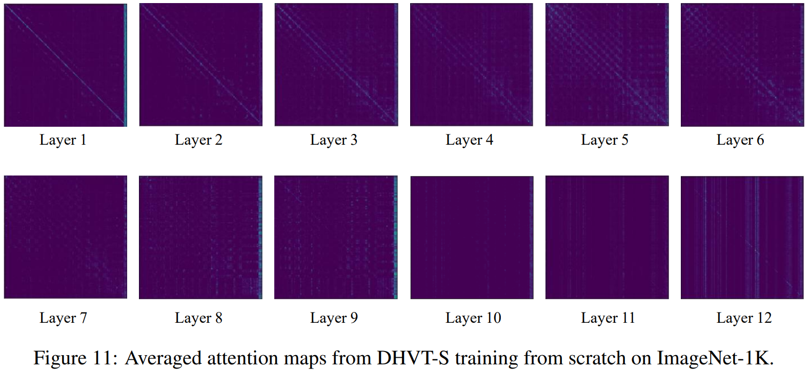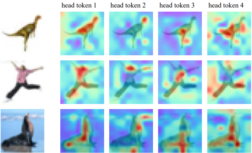 可以看到所有的token在网络的浅层时主要关注临近的token,提取局部信息。到了中间层,例如7-10层时,模型进行全局信息的交互,同时利用head token将各个head的表征融合在一起。到了最深层的11和12层,模型再次回归到全局信息的筛选,得到最终的分类信息表征。该图展示了一种可能的ViT信息提取方式,可能会对未来ViT模型的信息提取模式带来启发。