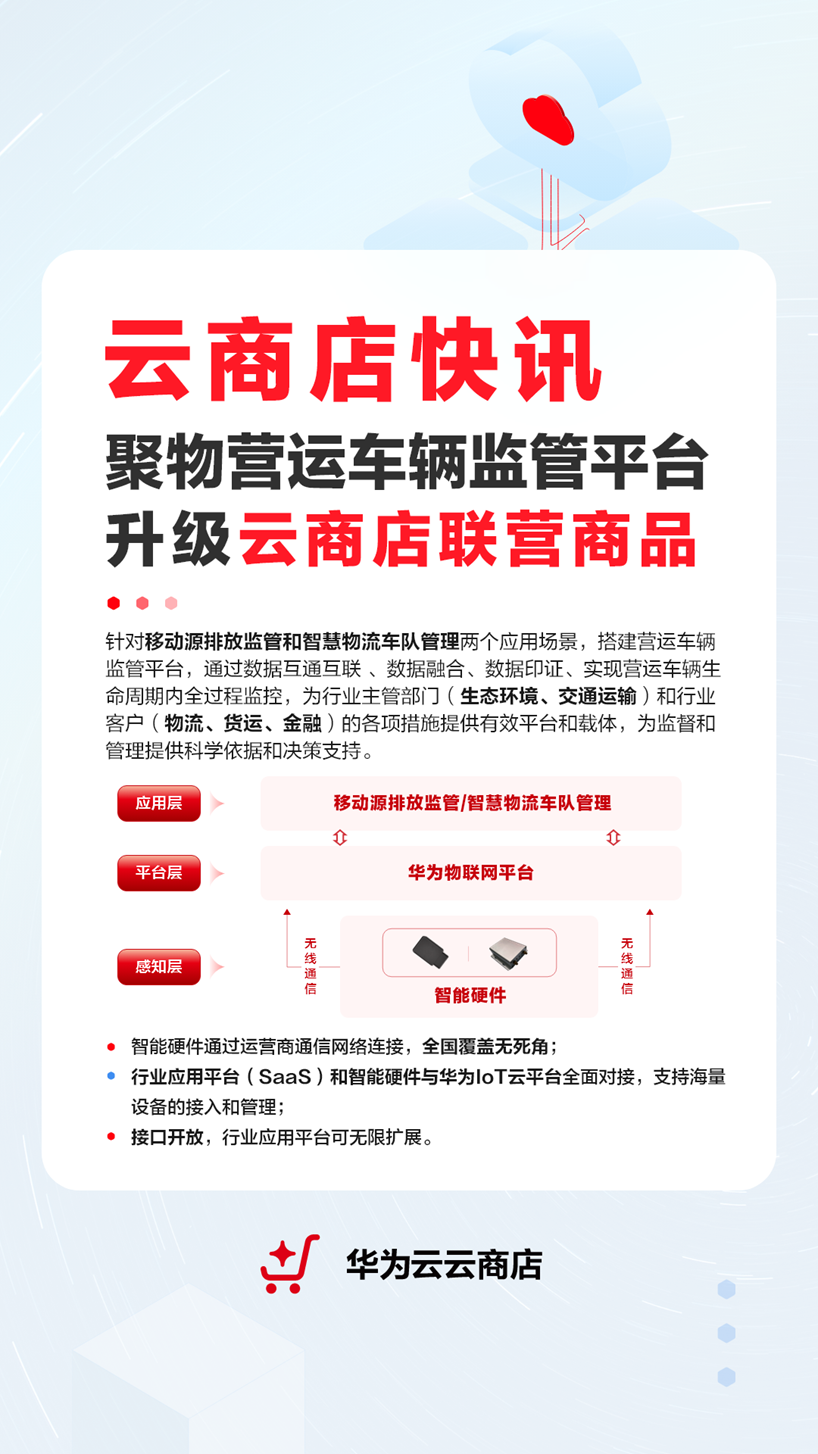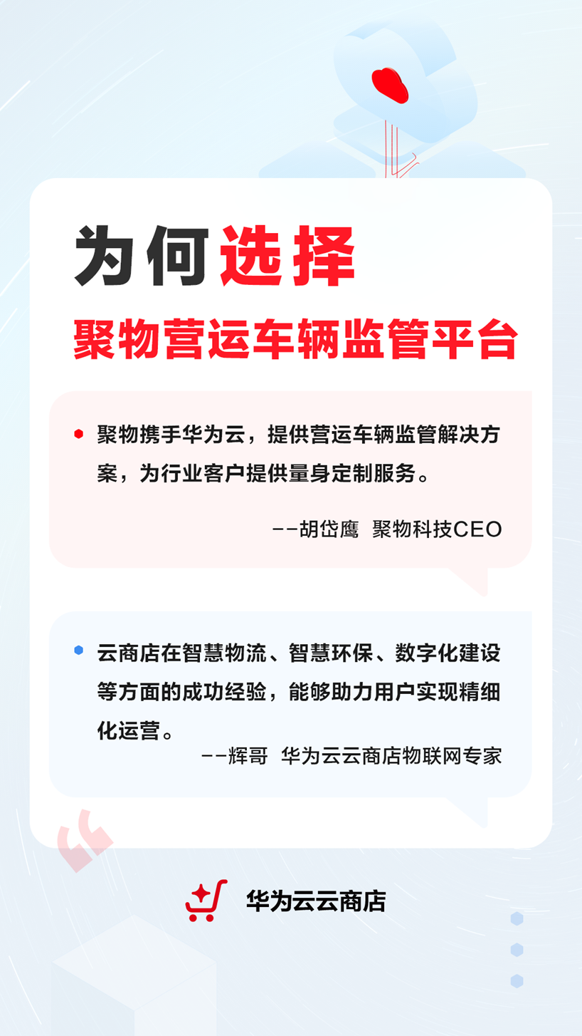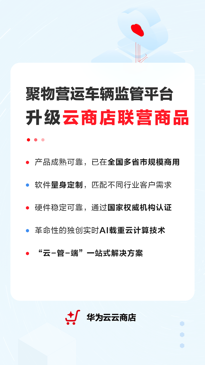 近期,深圳聚物网络科技有限公司(以下简称聚物科技)的聚物营运车辆监管平台正式升级华为云云商店联营商品。云商店携手聚物科技,为行业客户在营运车辆监管方面提供量身定制服务,提升管理效率,降低运营成本,增加新业务收入。