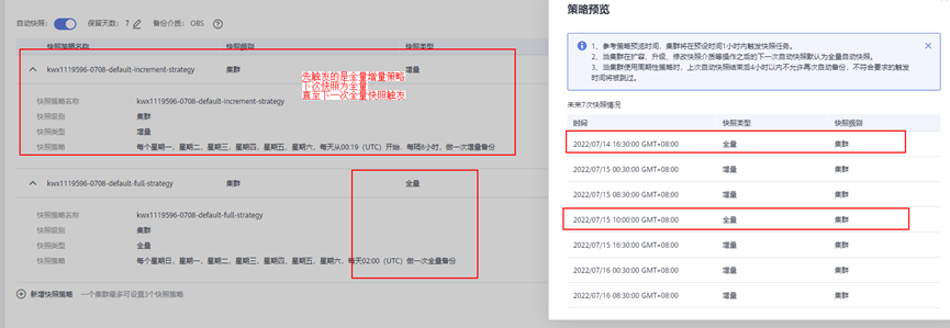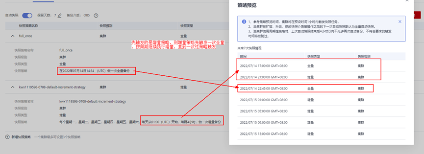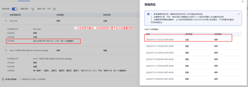 所有策略按时间排序,若最先触发的是增量策略,则第一次触发的为全量快照,后面的增量快照全部基于此次全量快照做增量,直到触发全量策略,产生新的全量快照,则后续增量快照基于新的全量继续执行。