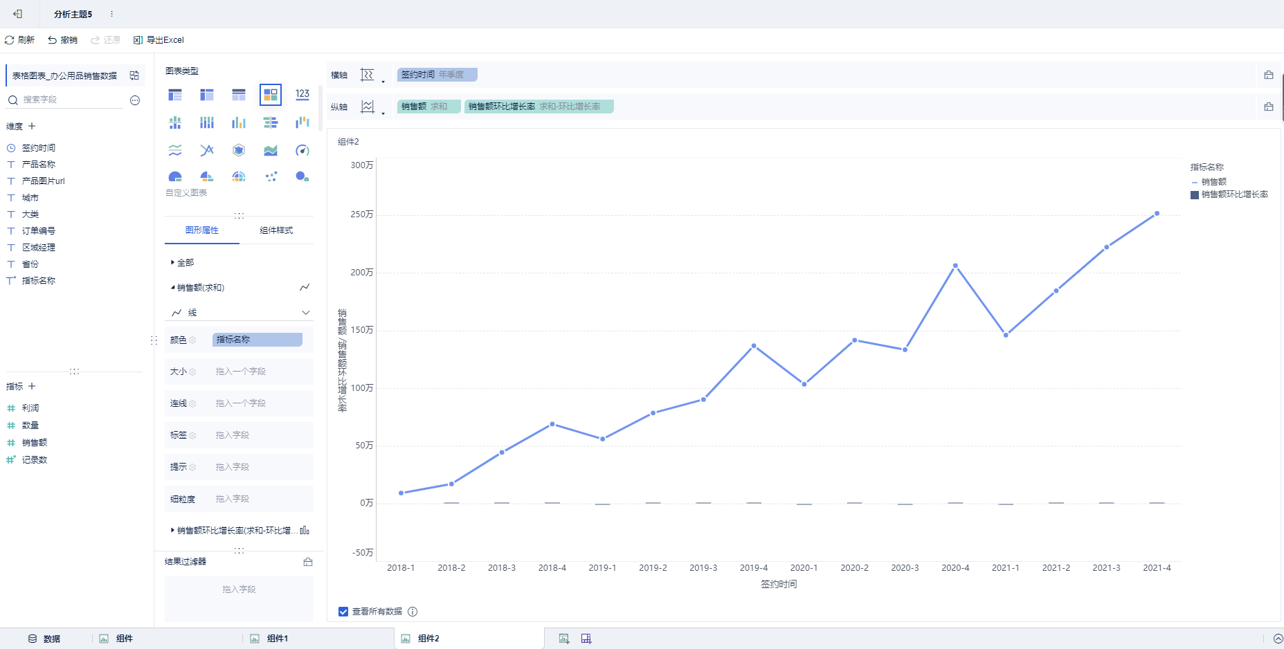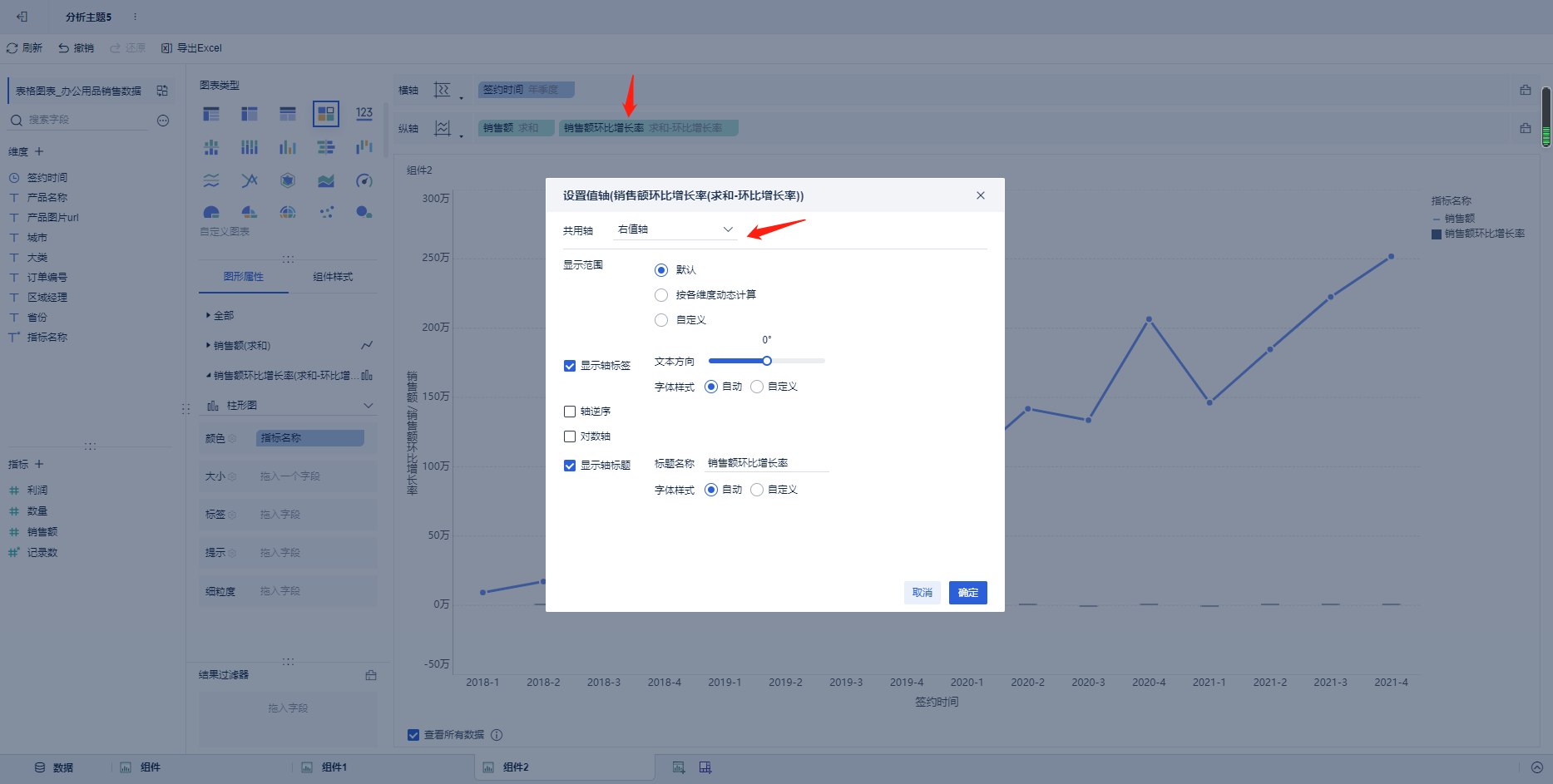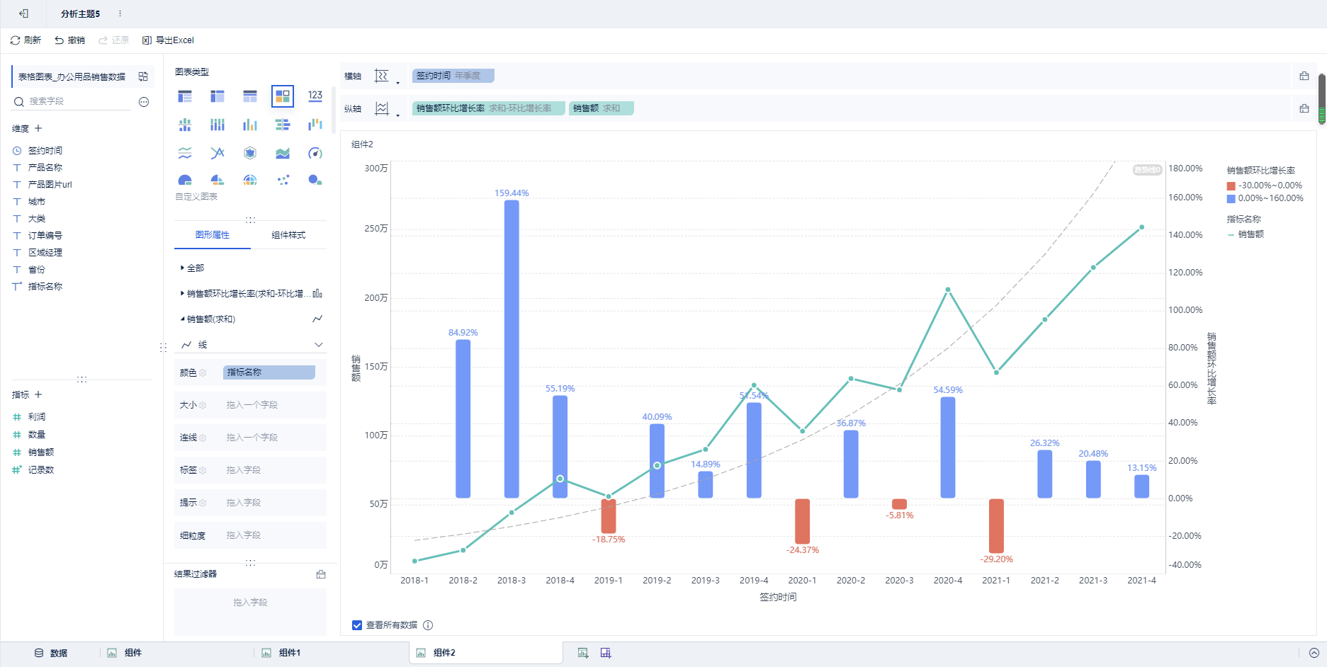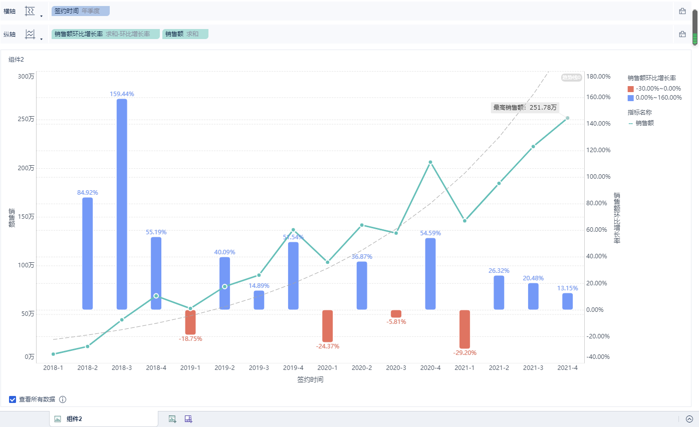 新增一个组件,默认图表(分组表),维度拖入签约时间,指标拖入销售额,并复制一个销售额快速计算环比增长率,修改销售额单位为万:
