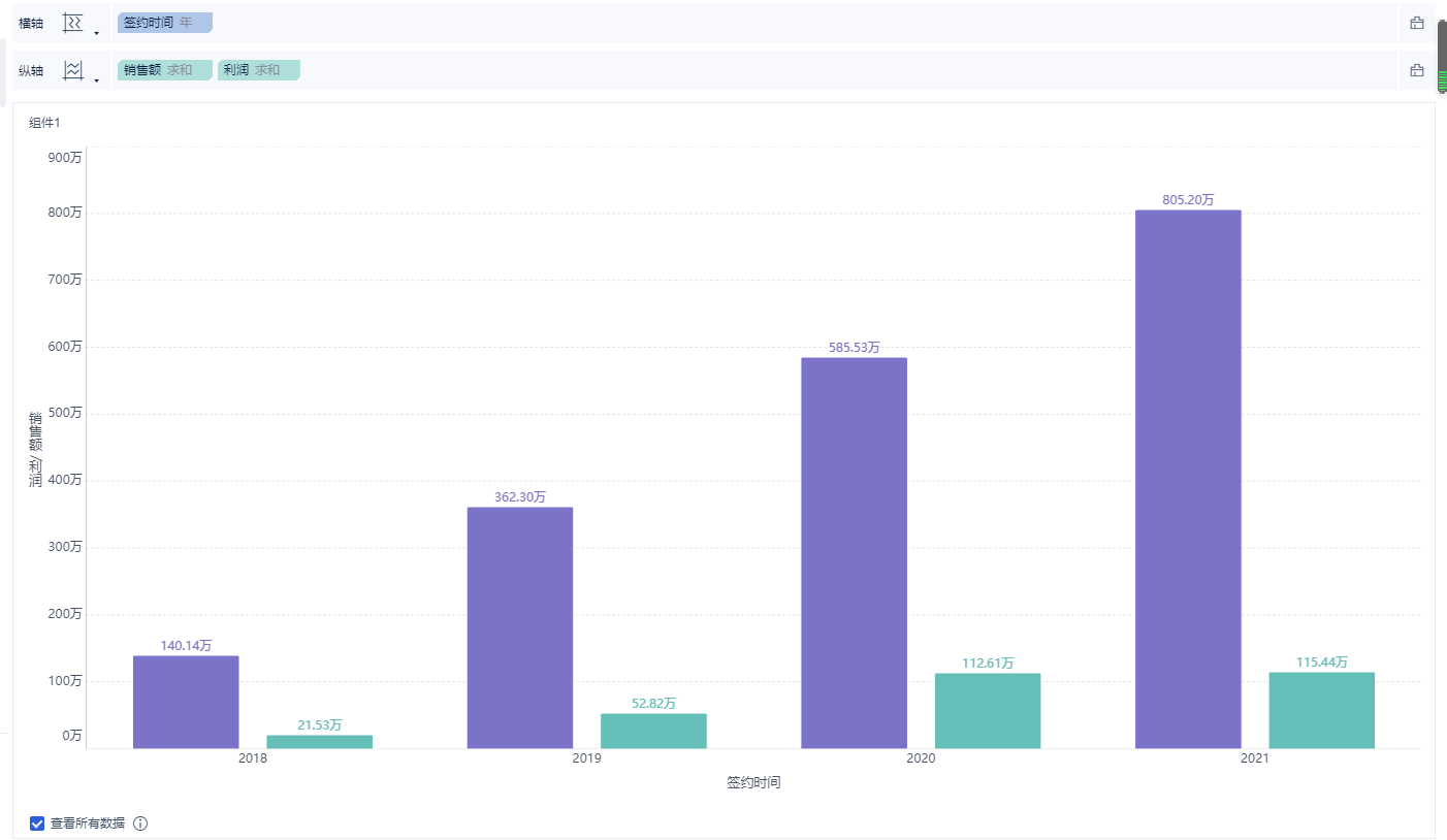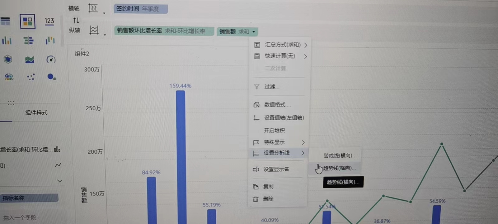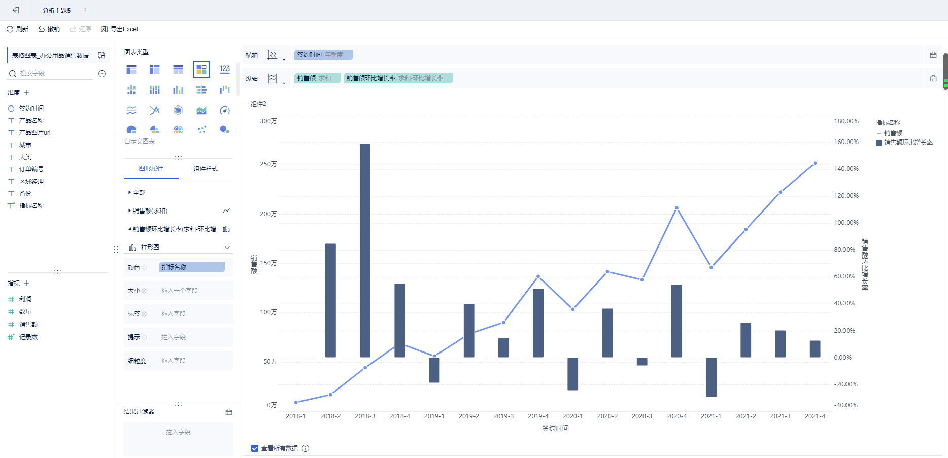 新增一个组件,默认图表(分组表),维度拖入签约时间,指标拖入销售额,并复制一个销售额快速计算环比增长率,修改销售额单位为万: