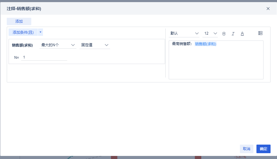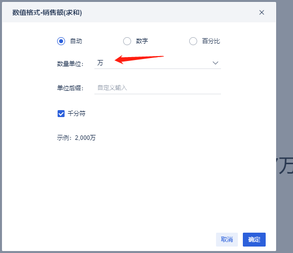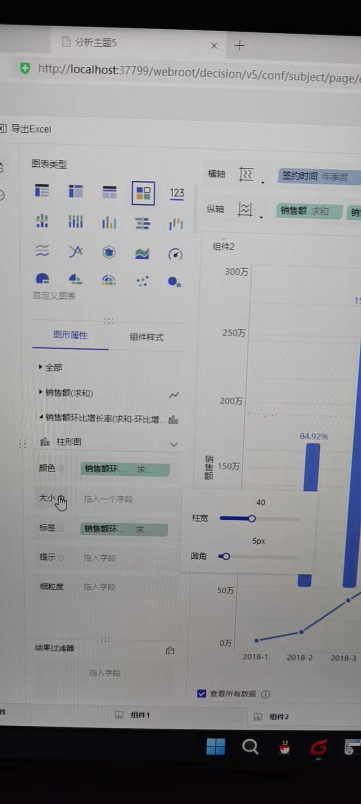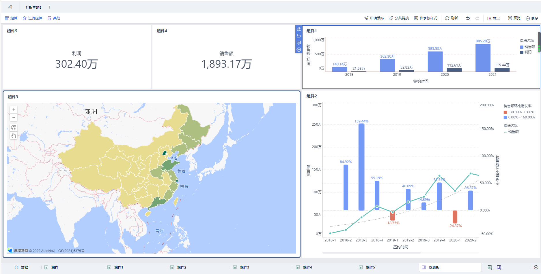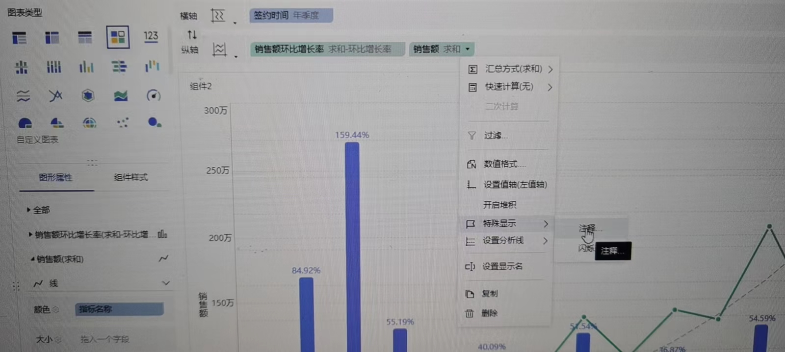 新增一个组件,默认图表(分组表),维度拖入签约时间,指标拖入销售额,并复制一个销售额快速计算环比增长率,修改销售额单位为万: