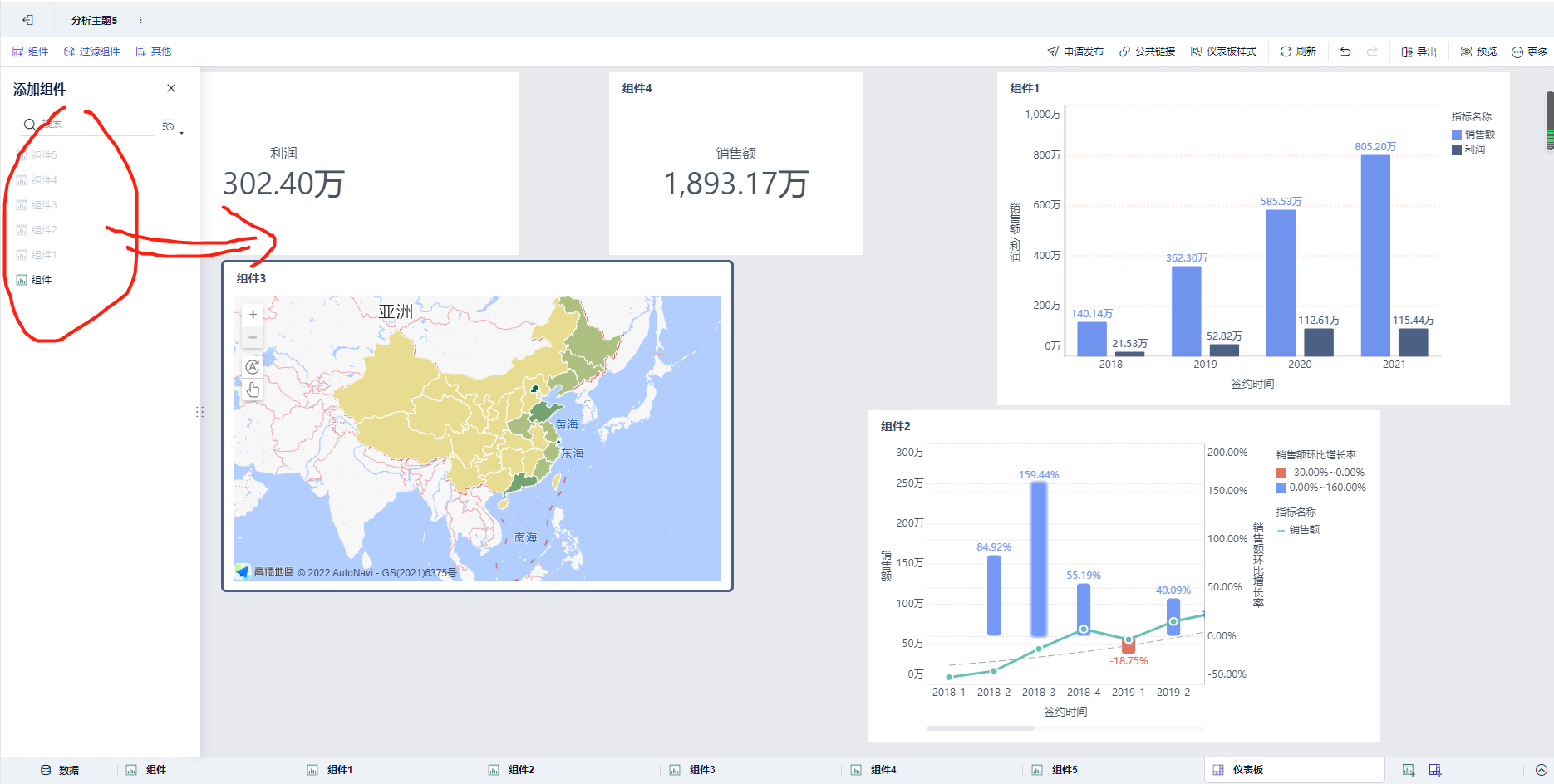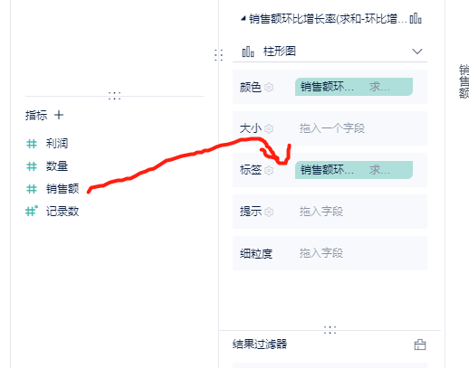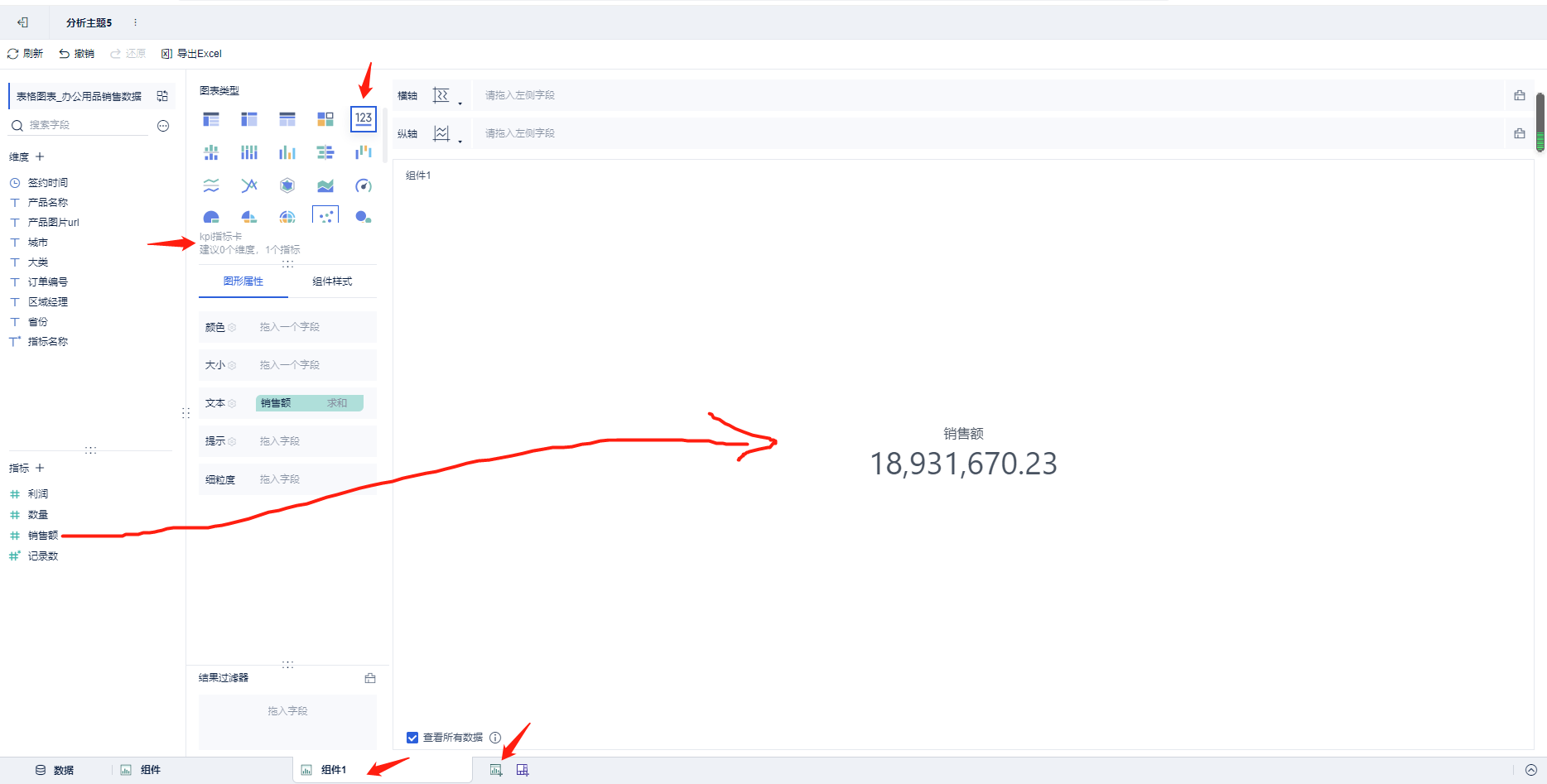 点击下方的新增组件按钮,新增一个组件;点击图表类型为第一排左右一个123的那个(显示为 kpi指标卡),将左边指标 销售额拖到右边空白处:右边会显示销售额多少钱。。。