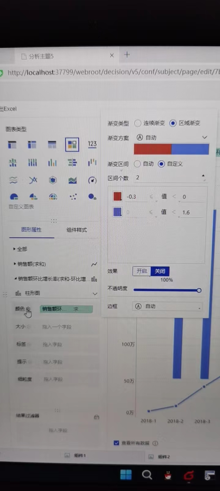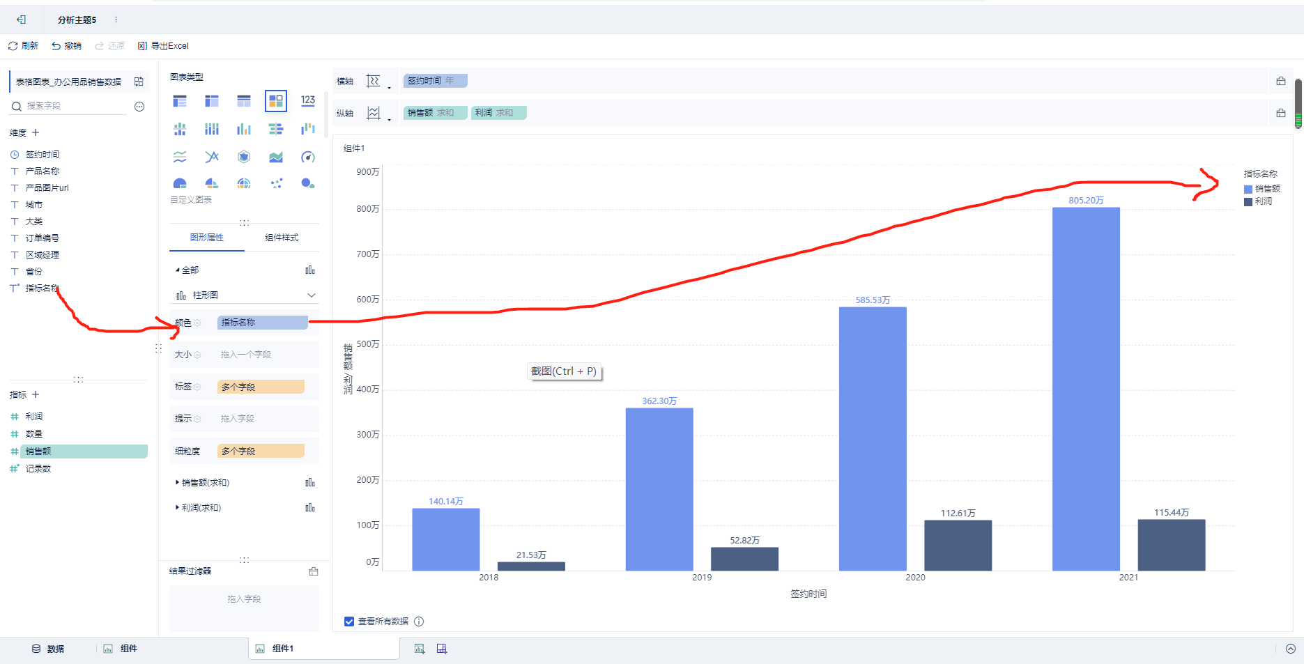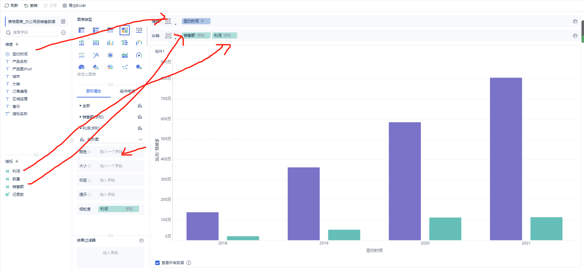 新增组件,设置为柱形图,然后拖入以下指标,并在图形属性中针对不同的内容设置不同的颜色,可以得到以下图形: