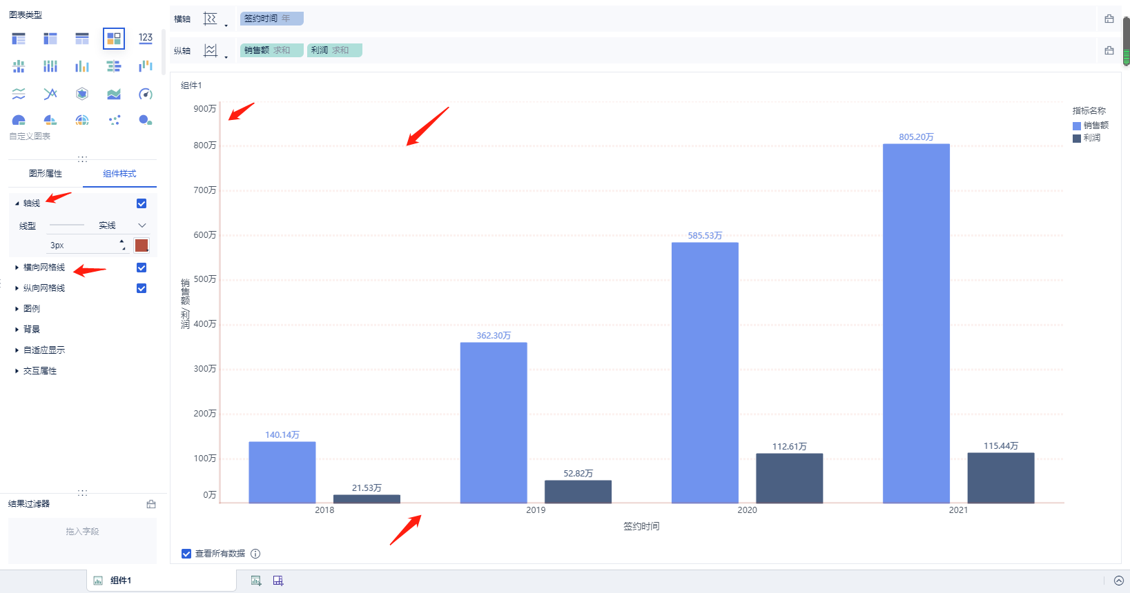 我们还可以做些美化,比如在 组件样式中,增加 轴线和 横向网格线: