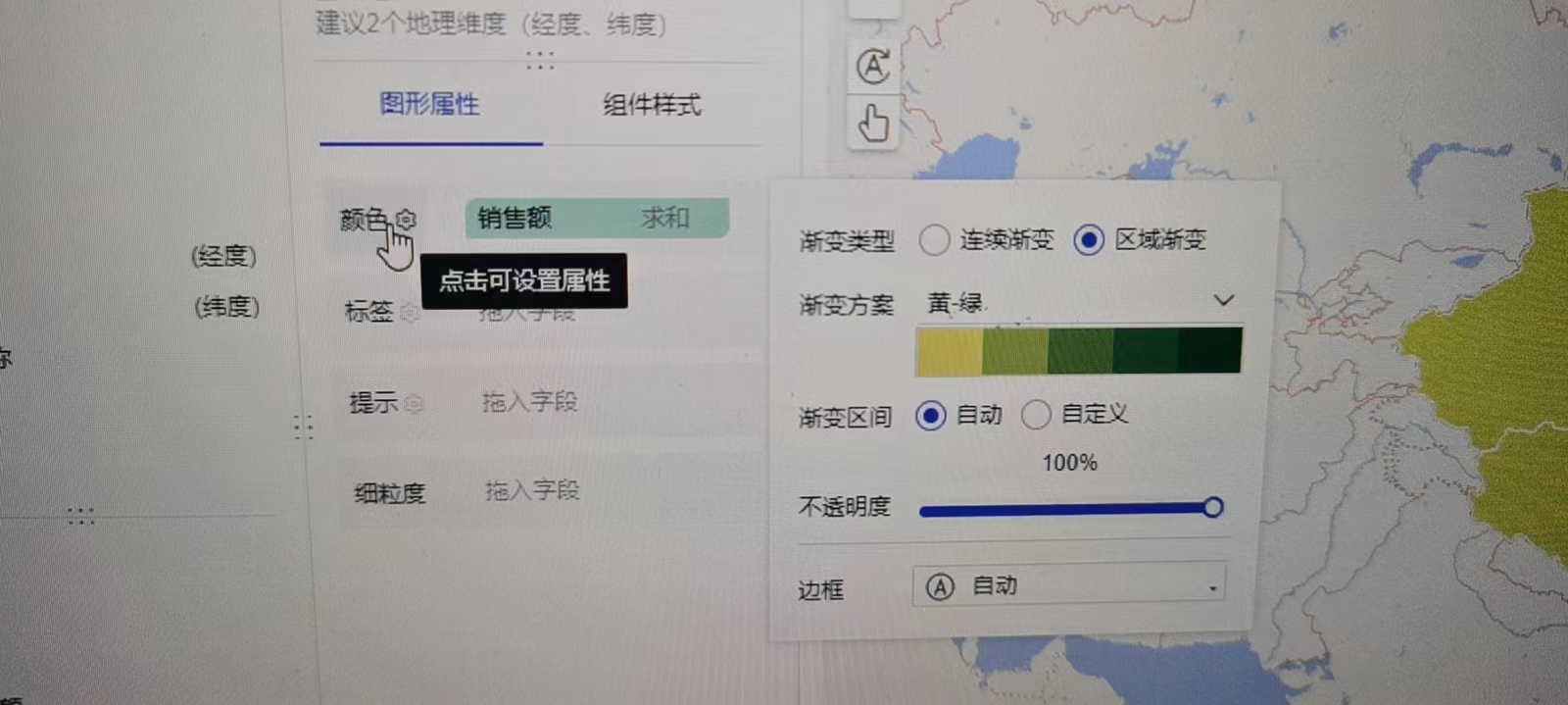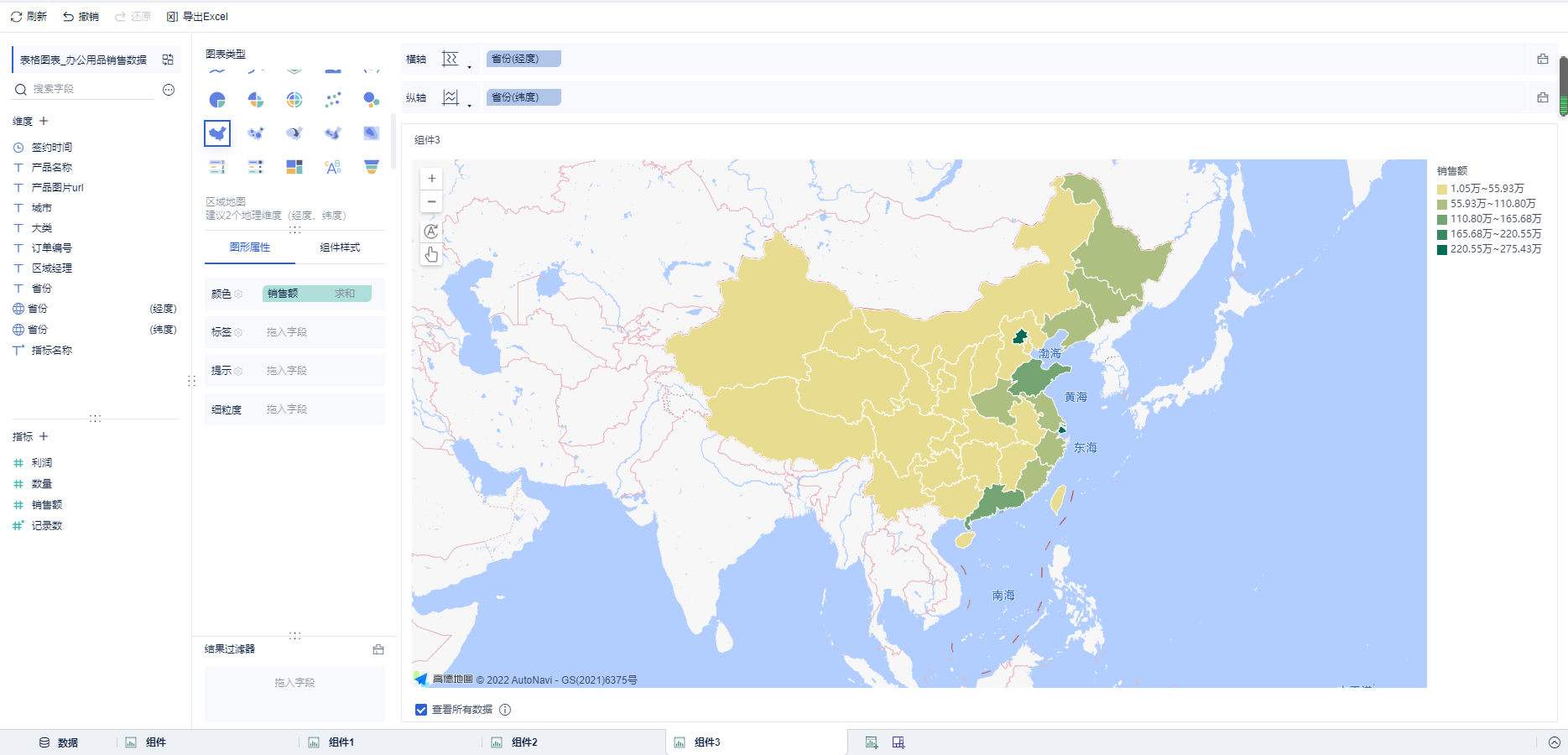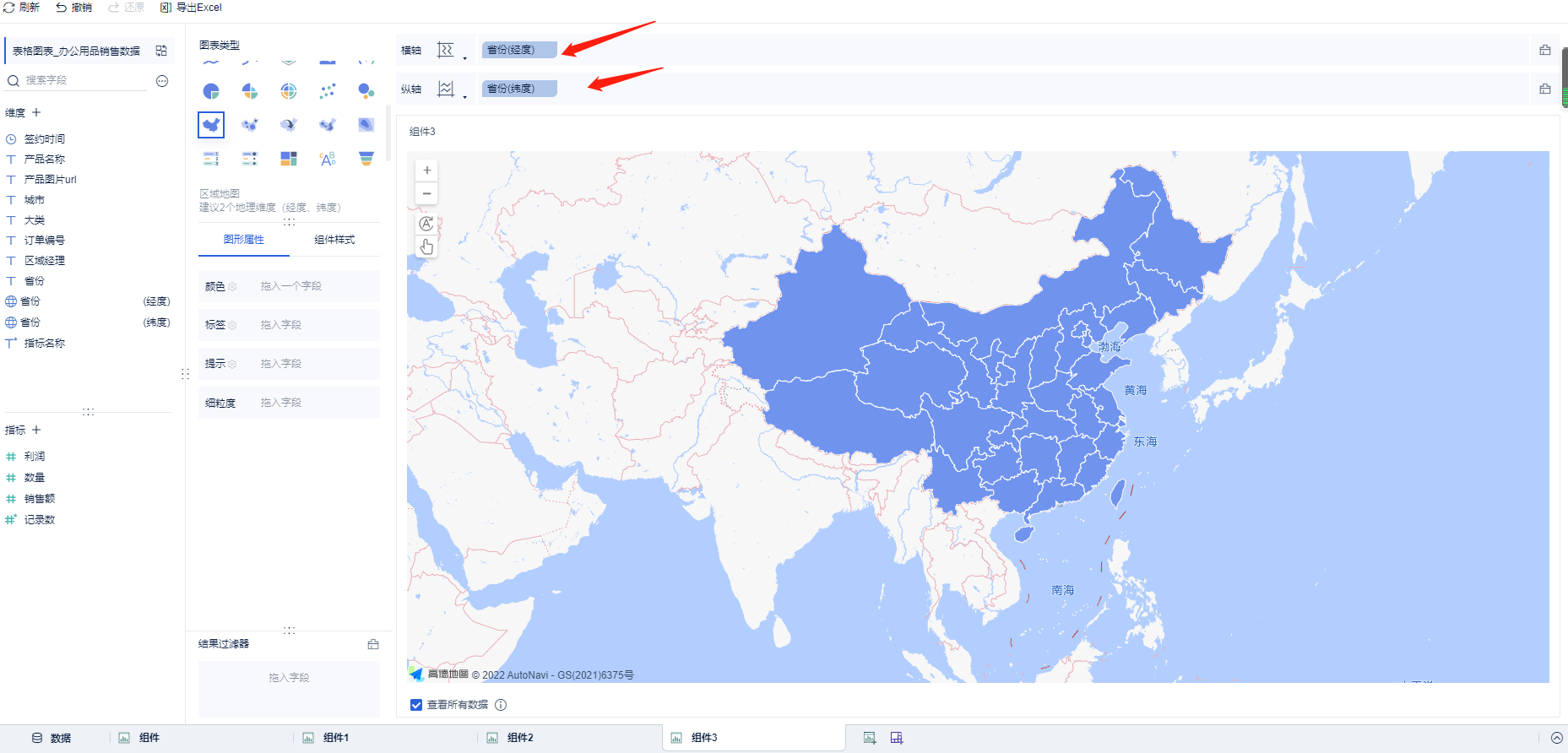 选择 区域地图,横轴放入经度,纵轴放入纬度: