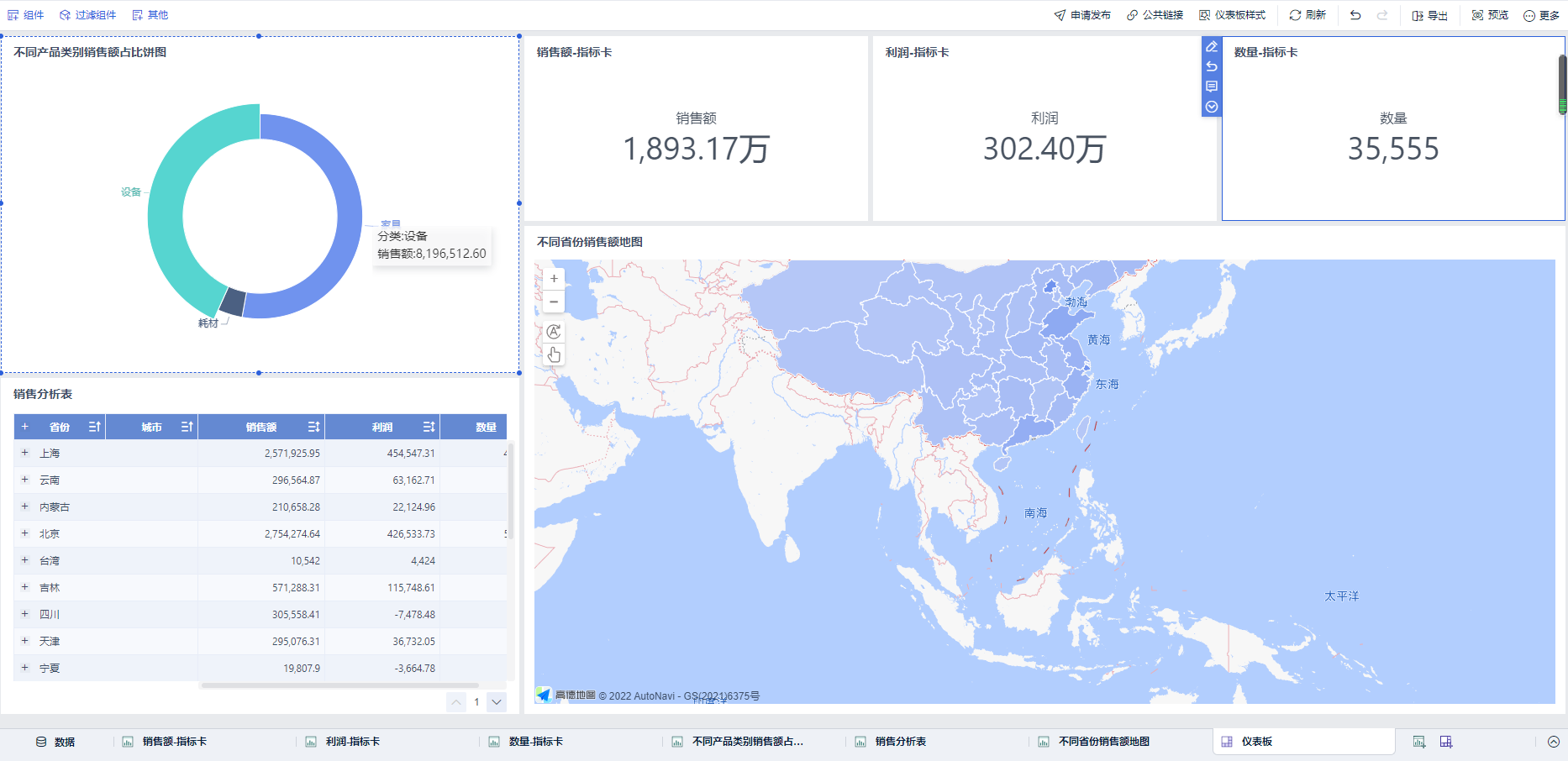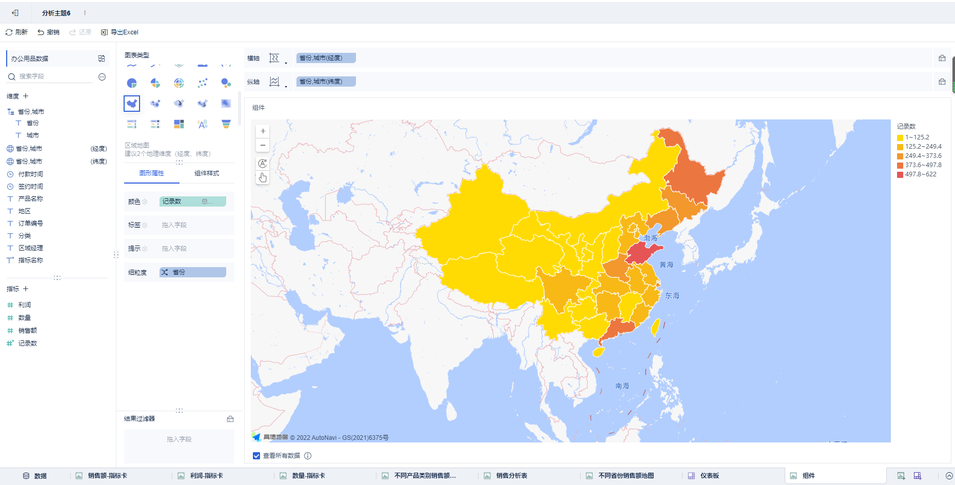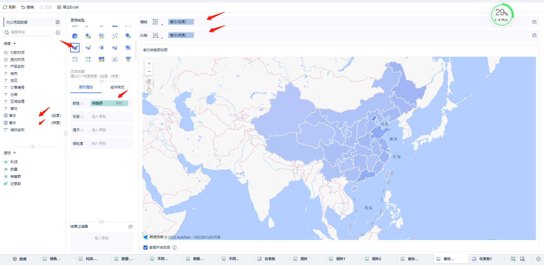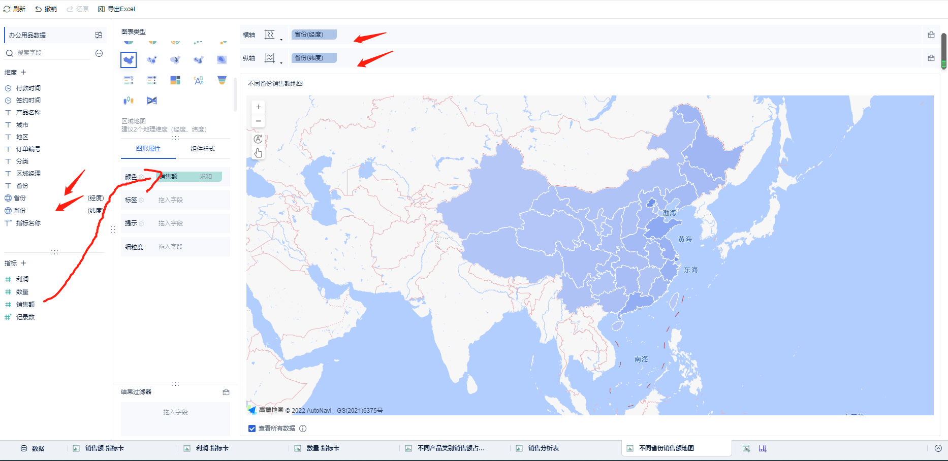再增加一个组件:不同省份销售额地图,类型为 区域地图。