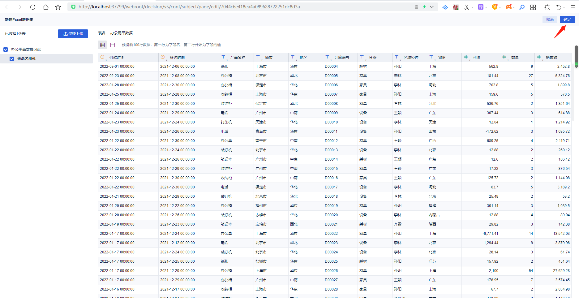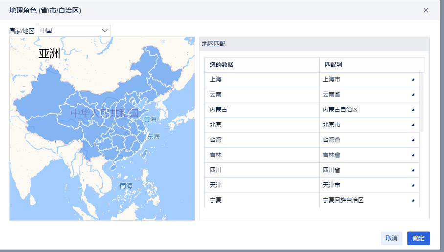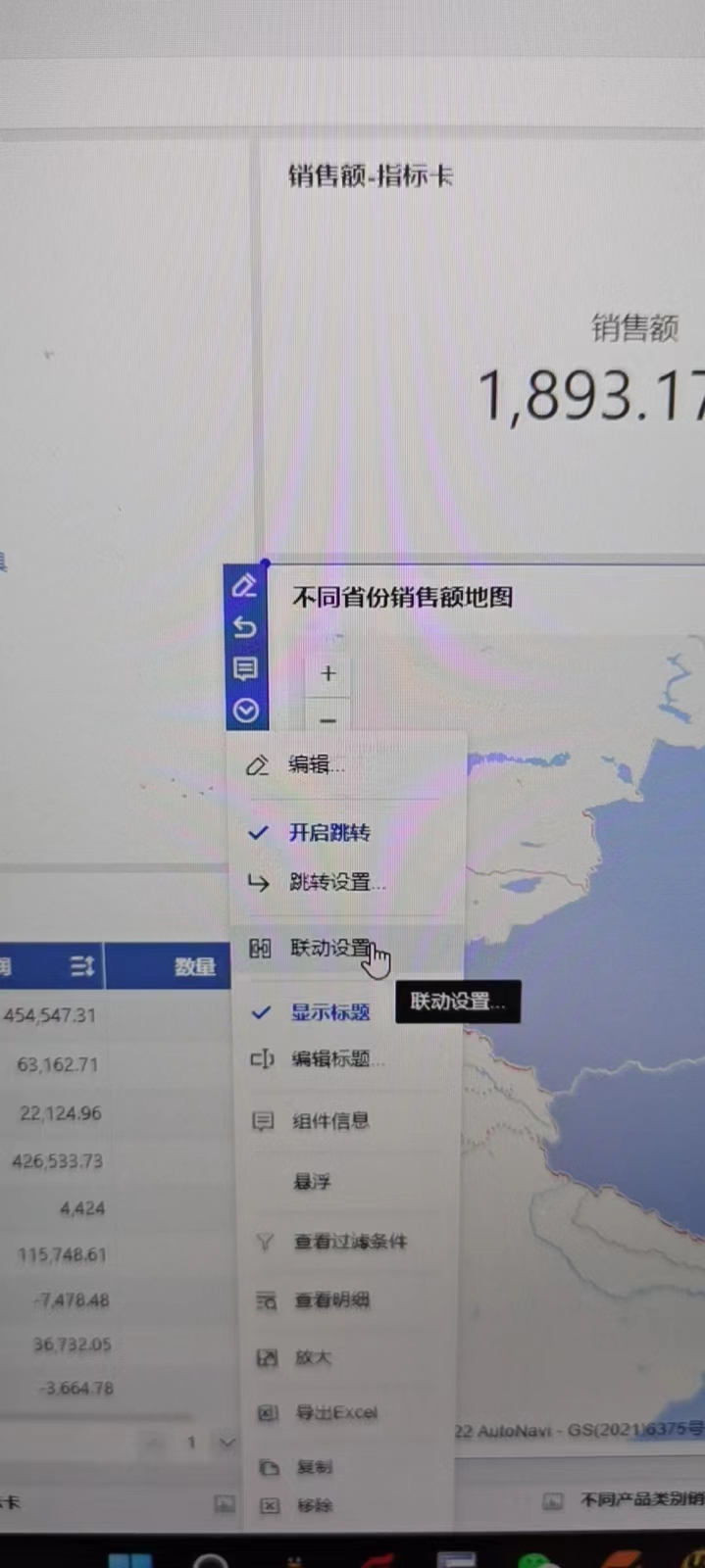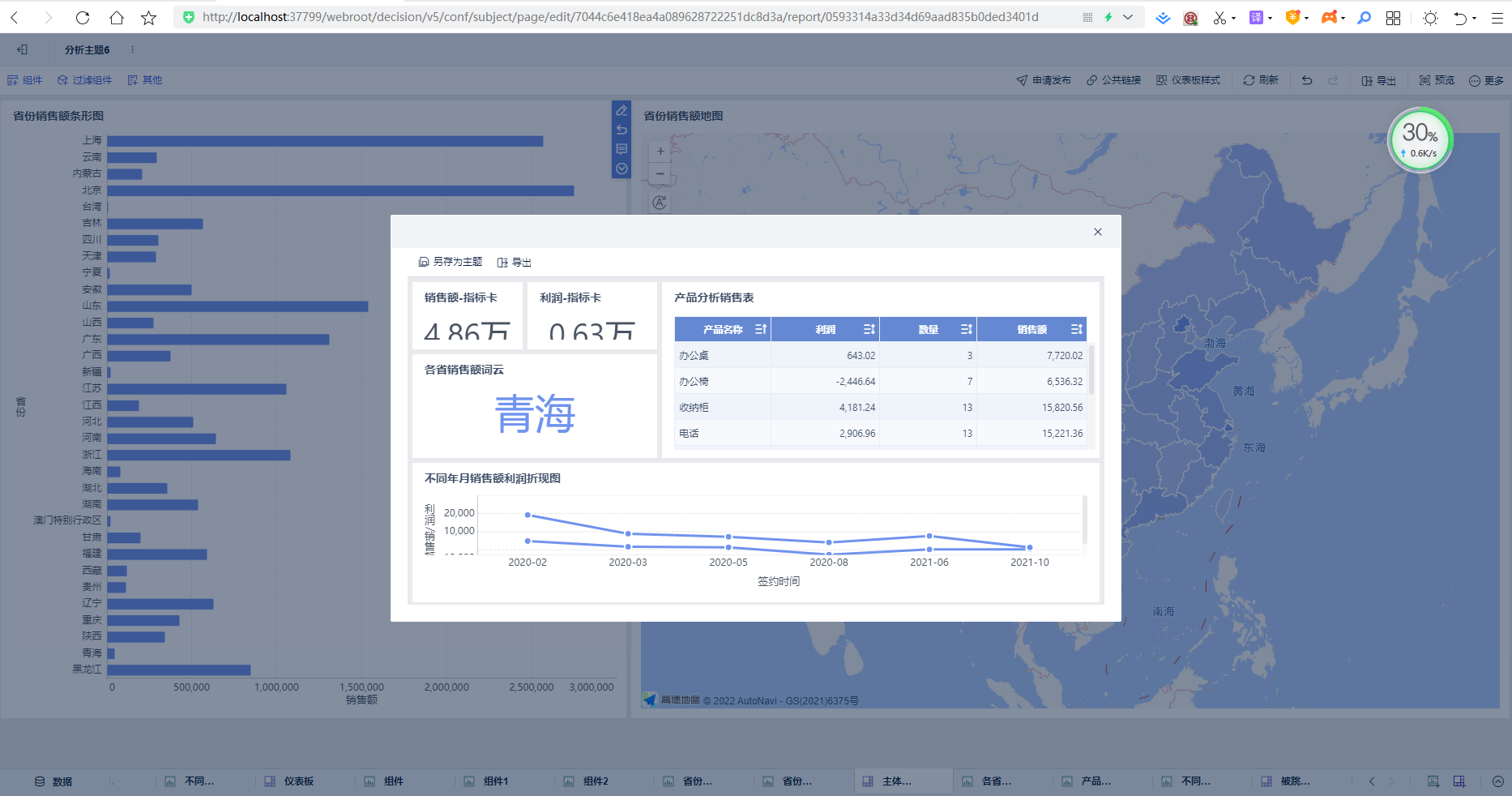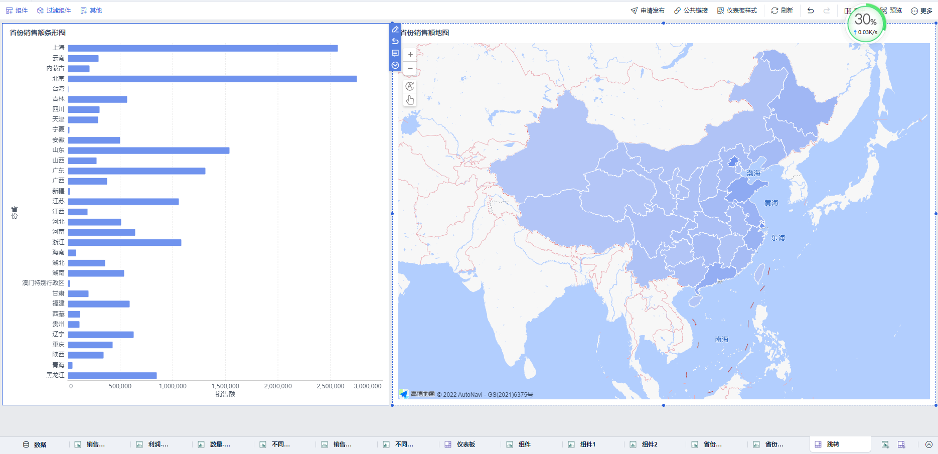 再增加一个组件:不同省份销售额地图,类型为 区域地图。