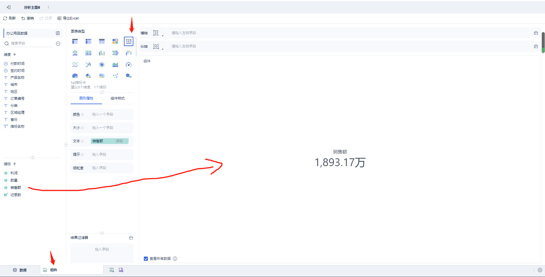 再新增一个组件,制作另两个KPI指标:利润(利润-指标卡 )和数量(数量-指标卡 ):