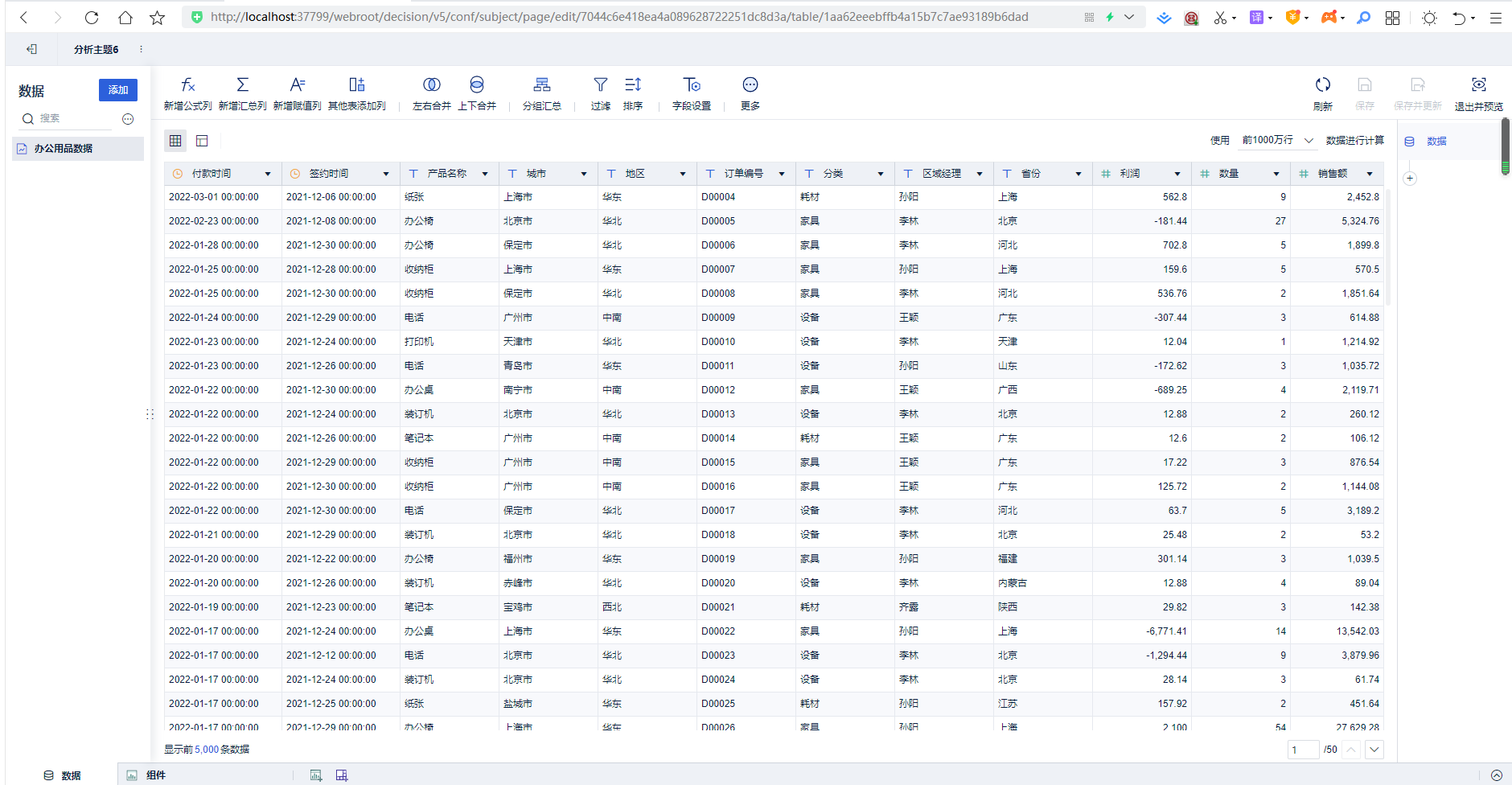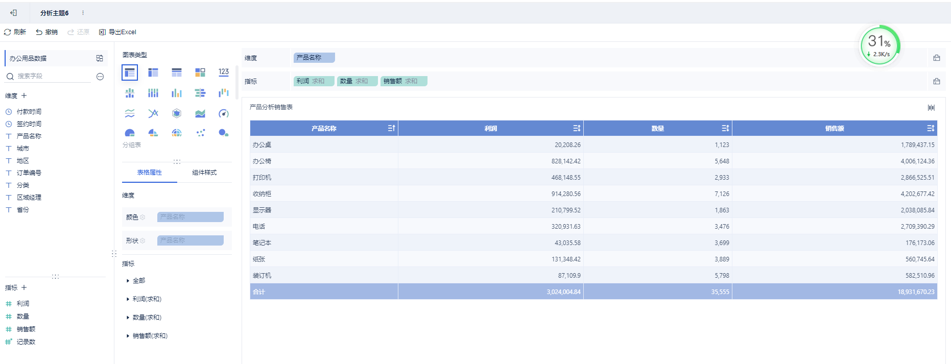 新增一个组件:产品分析销售表,类别为分组表,维度为产品名称,指标为利润,数量和销售额: