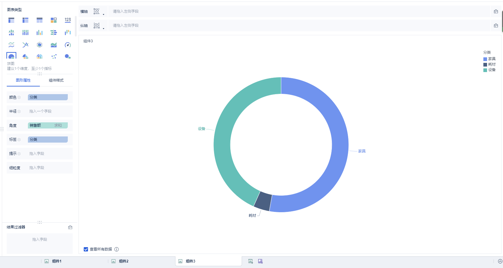 再新增一个组件:不同产品类别销售额占比饼图,制作饼图,颜色、标签为“分类”,角度为“销售额”。