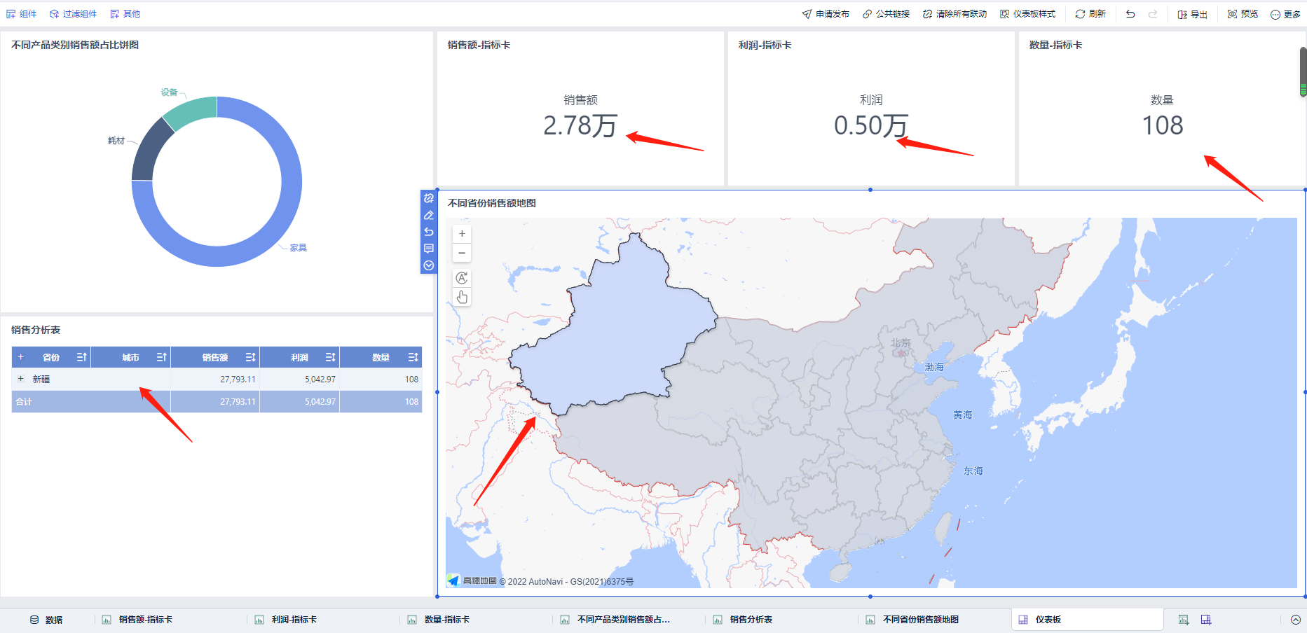 在地图上点击新疆,则组件就只显示了新疆的相关指标: