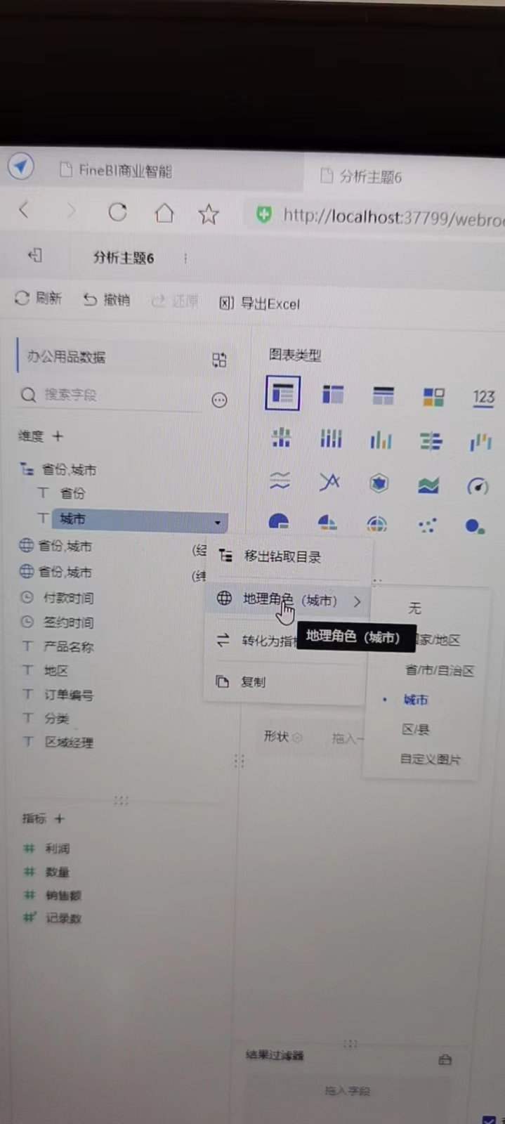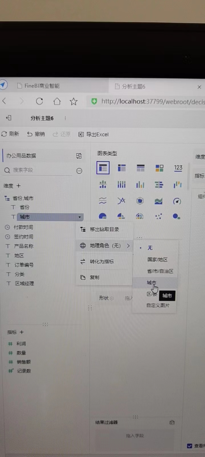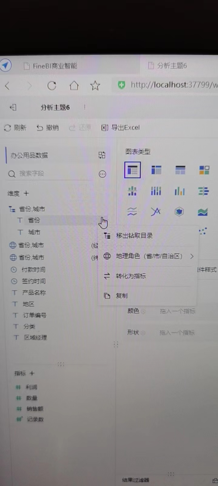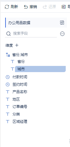 先把省市做成钻取目录(将维度中的城市拖到 省)