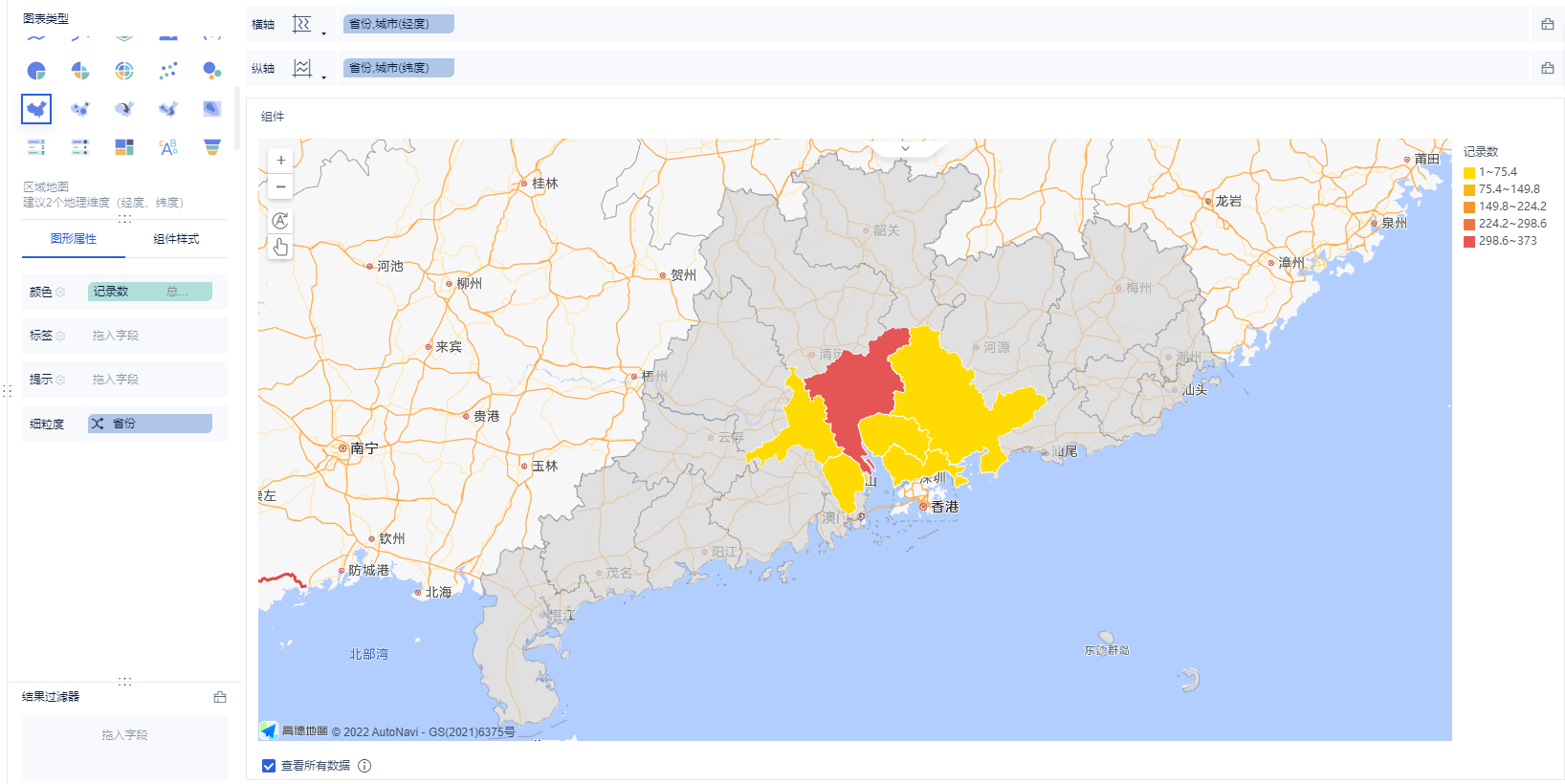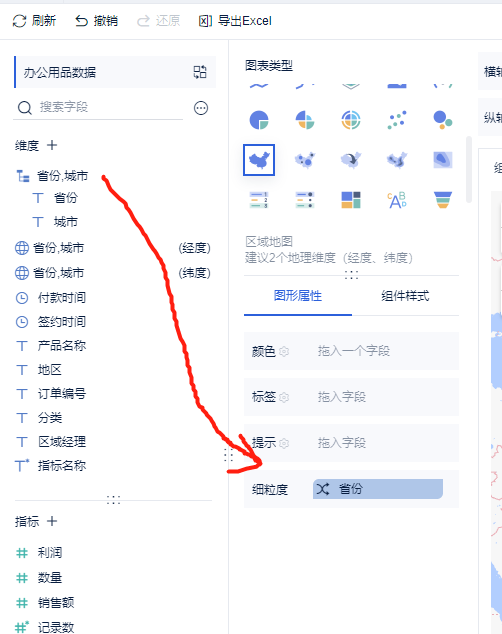 在本组件中,图表改为区域地图,将经纬度拖入两个轴,将 钻取目录 拖入 图形属性下“颜色、标签、提示和细粒度” 的其中任意一个即可。