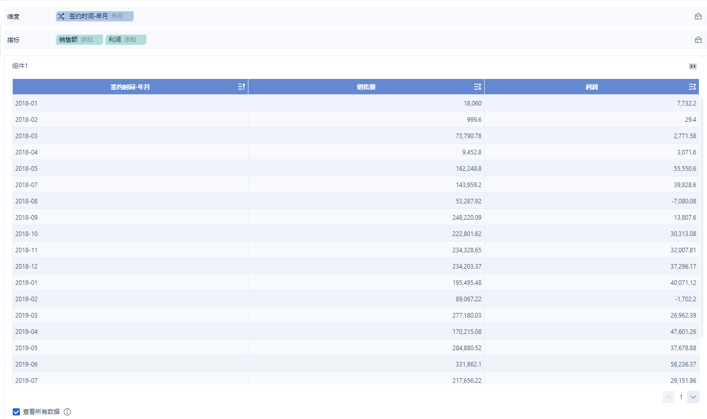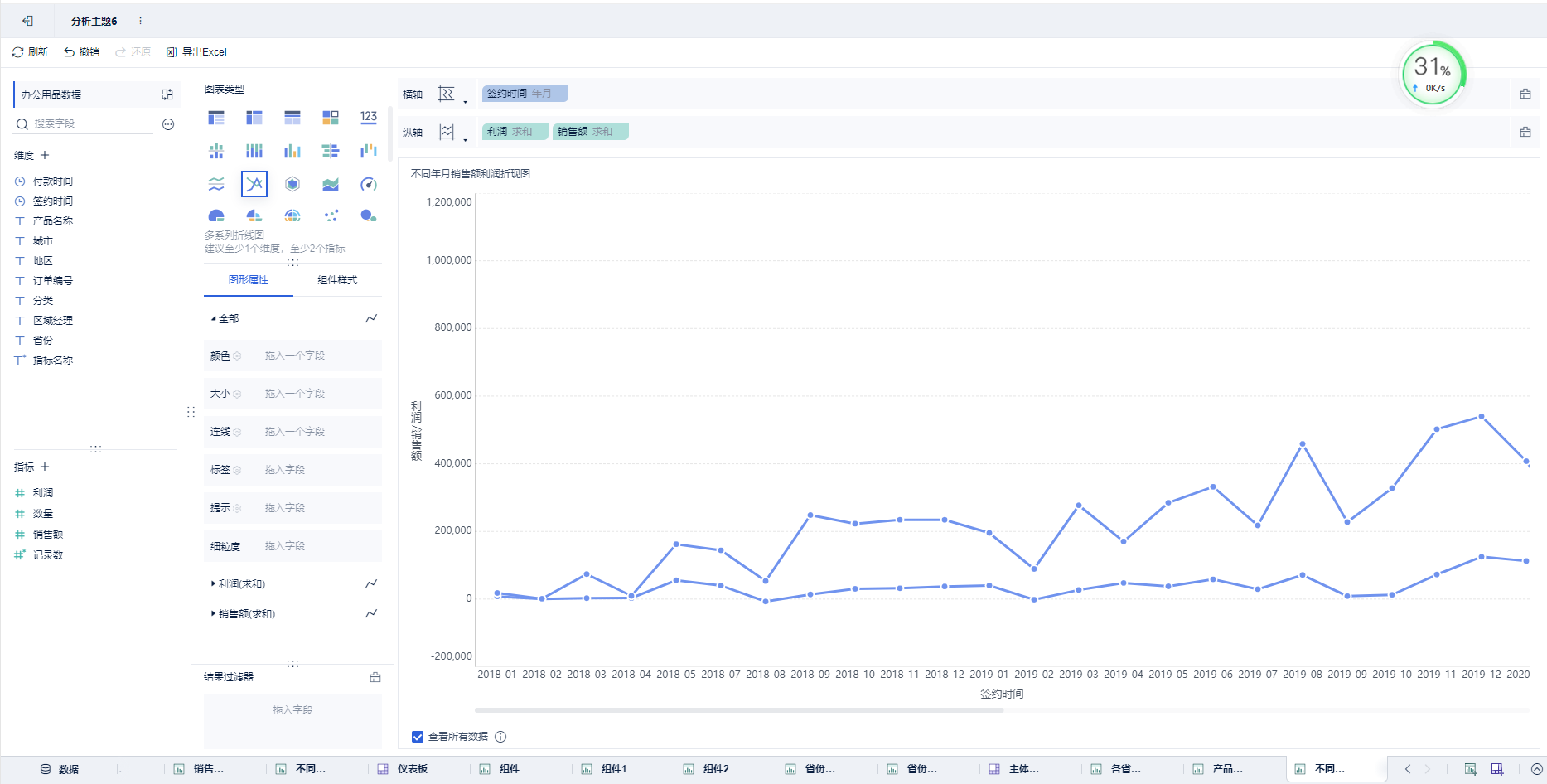 新增一个组件:不同年月销售额利润折现图,类型为 多系列折线图,横轴为 签约时间(设置成年月),纵轴为 利润 ,销售额。