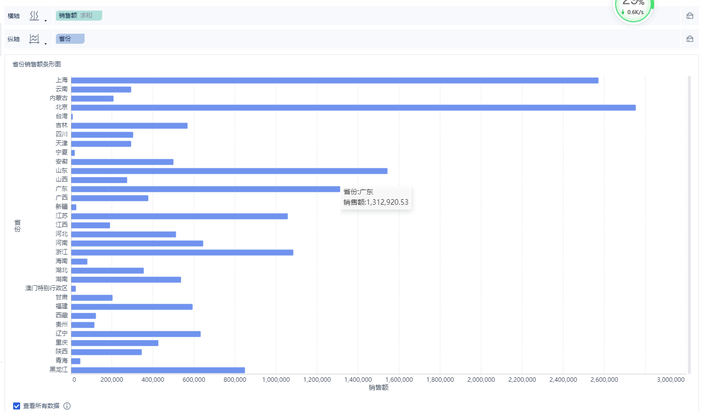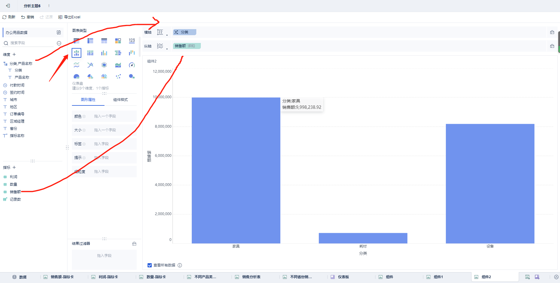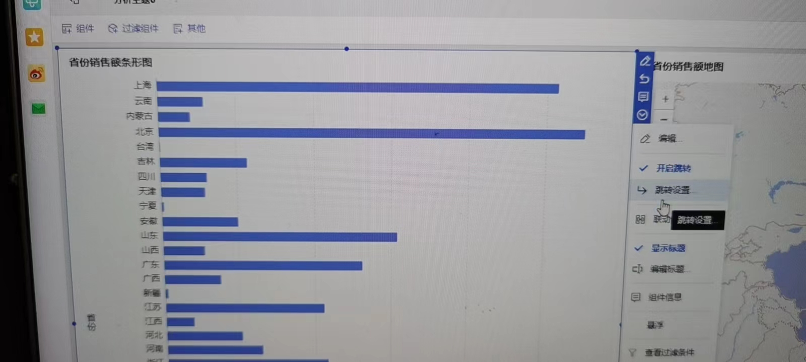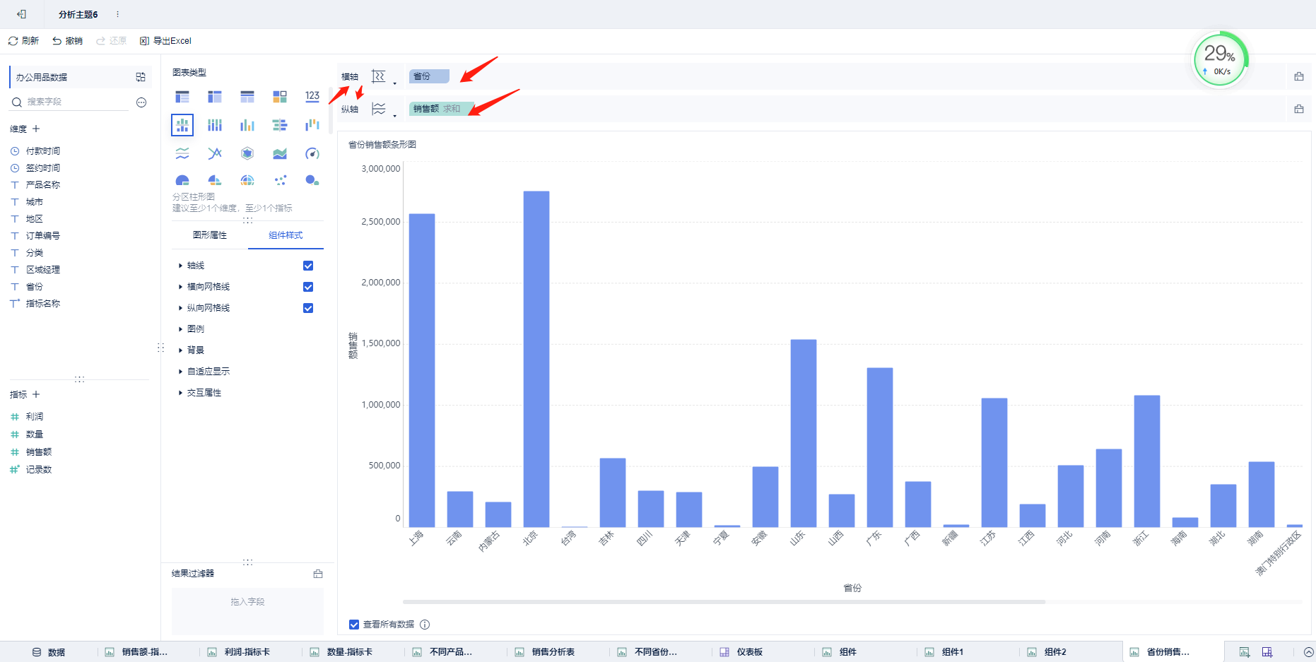 首先添加组件:省份销售额条形图,选择柱形图,横轴为省份,纵轴为销售额