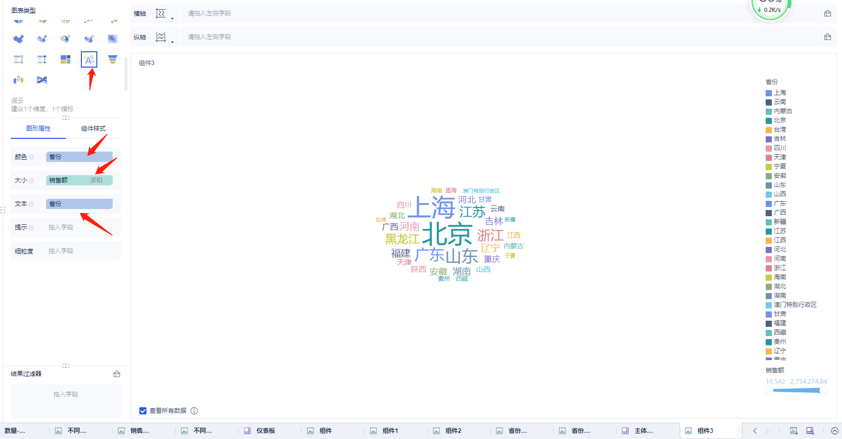 新增一个组件:各省销售额词云,选择「词云」并在文本拖入「省份」,大小拖入「销售额」,颜色拖入「省份」