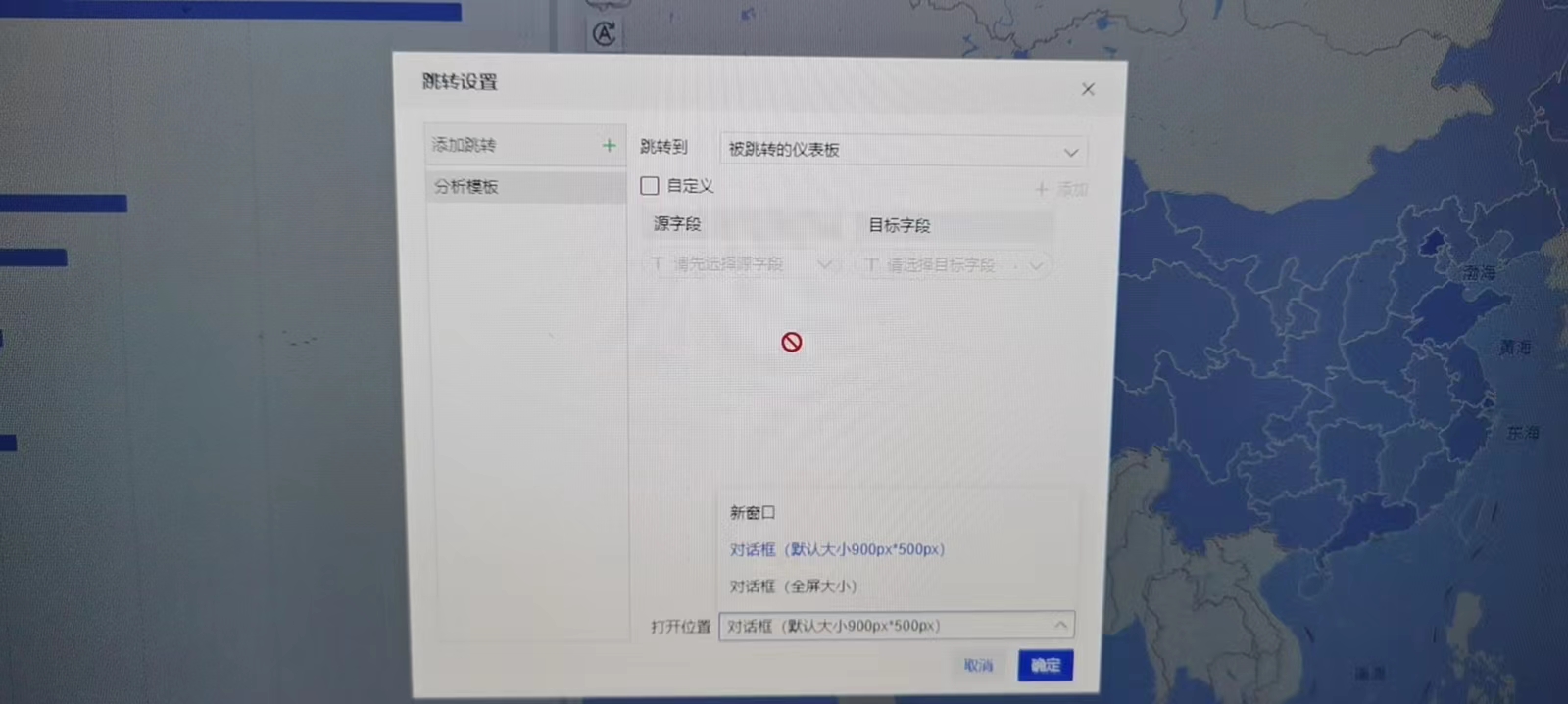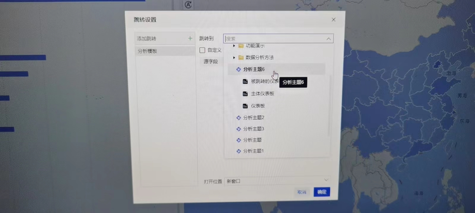 点击跳转设置:点击+,选择 分析模板,在右边的下拉菜单选择 某个分析主题下的仪表板——被跳转的仪表板: