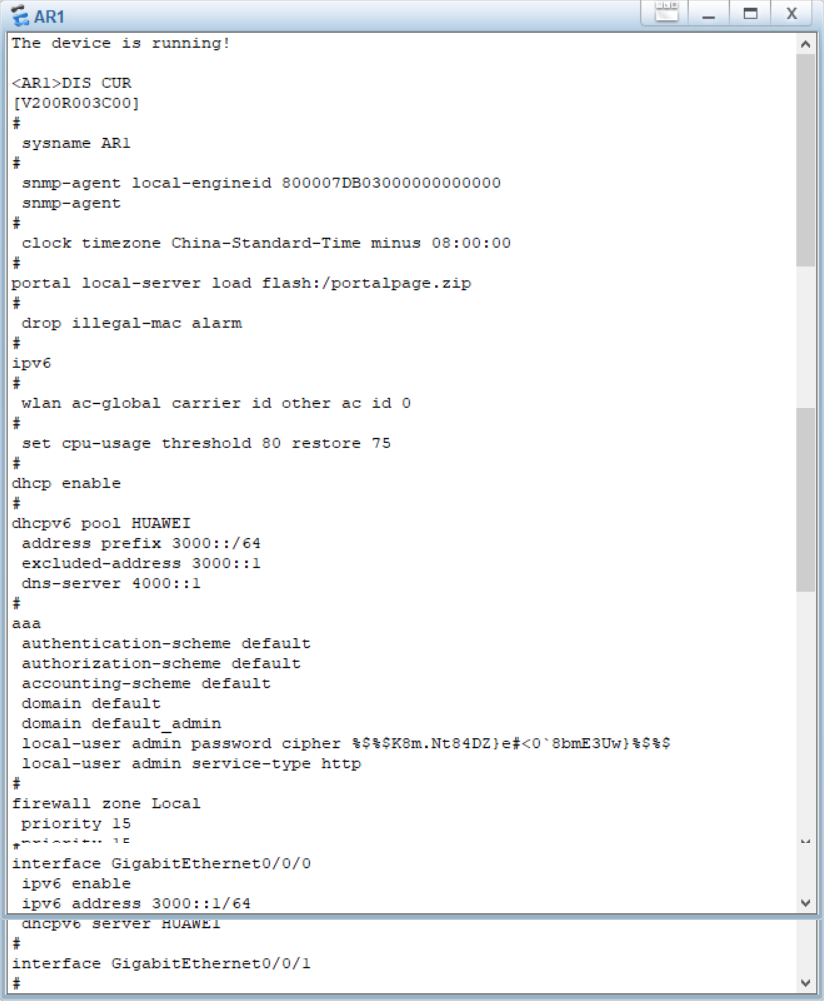 配置思路:首先对AR1进行一系列配置:包括开启IPv6地址和DHCPv6服务,并对其进行细致配置。