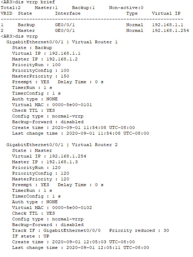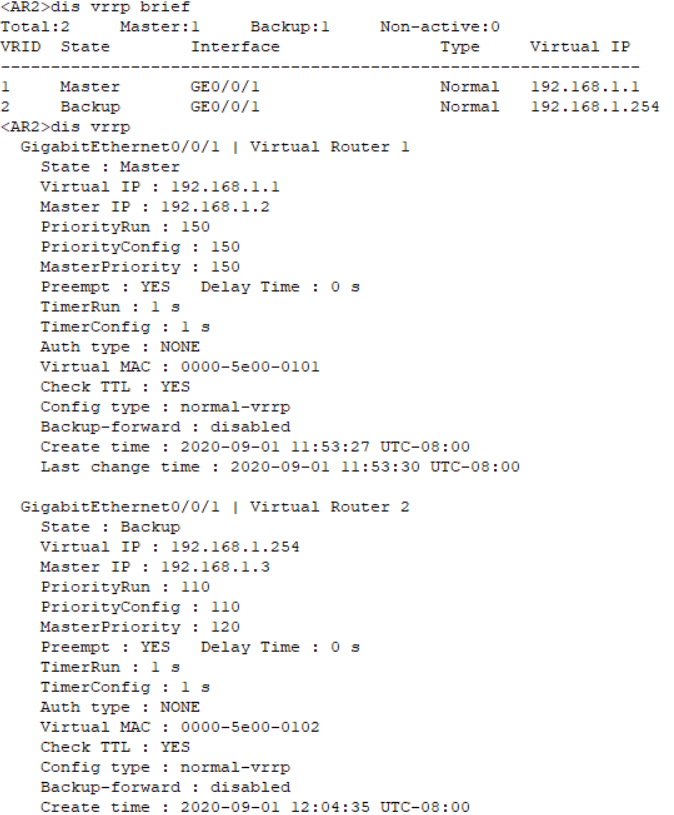 [AR2-GigabitEthernet0/0/1]vrrp vrid 2 virtual-ip 192.168.1.254 [AR2-GigabitEthernet0/0/1]vrrp vrid 2 priority 110