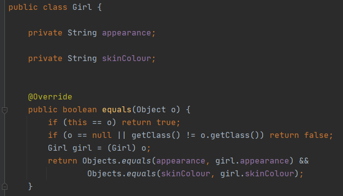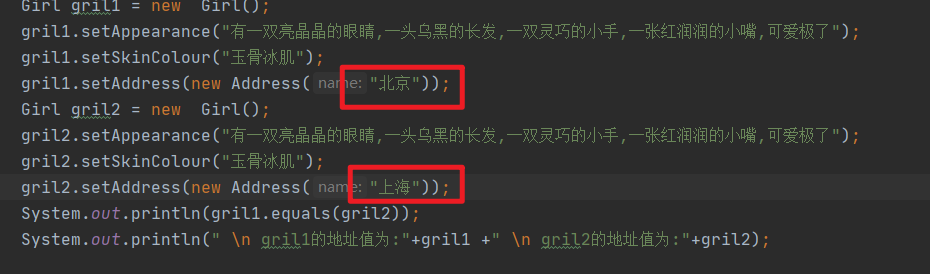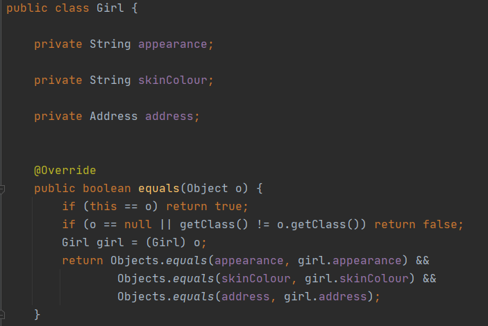 我们在Girl对象中添加地址对象属性,在重写equals方法:
