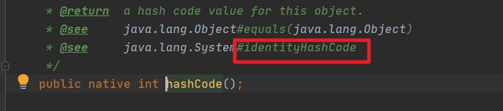 hashCode()方法被定义在Object类中。这也就意味着任何一个类都有hashCode()这个方法(和equals()方法一样,都是被定义在Object对象中)。查看Object的源码,我们可以发现,次方法被native关键字修饰的。也就是说,Object中的hashCode()方法调用的是本地方法的。其实就是调用操作系统自己的hashCode()方法(用C语言或者是C++语言实现的)。该方法通常用来将对象的内存地址转换成整数后返回的。