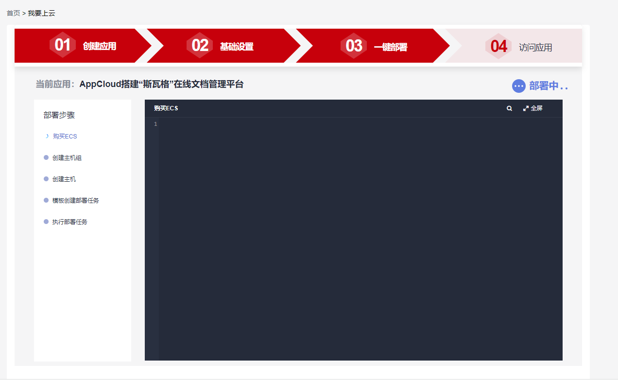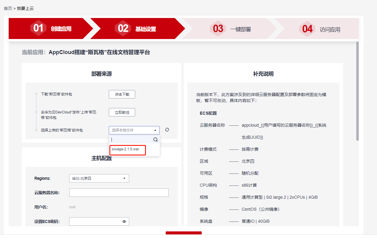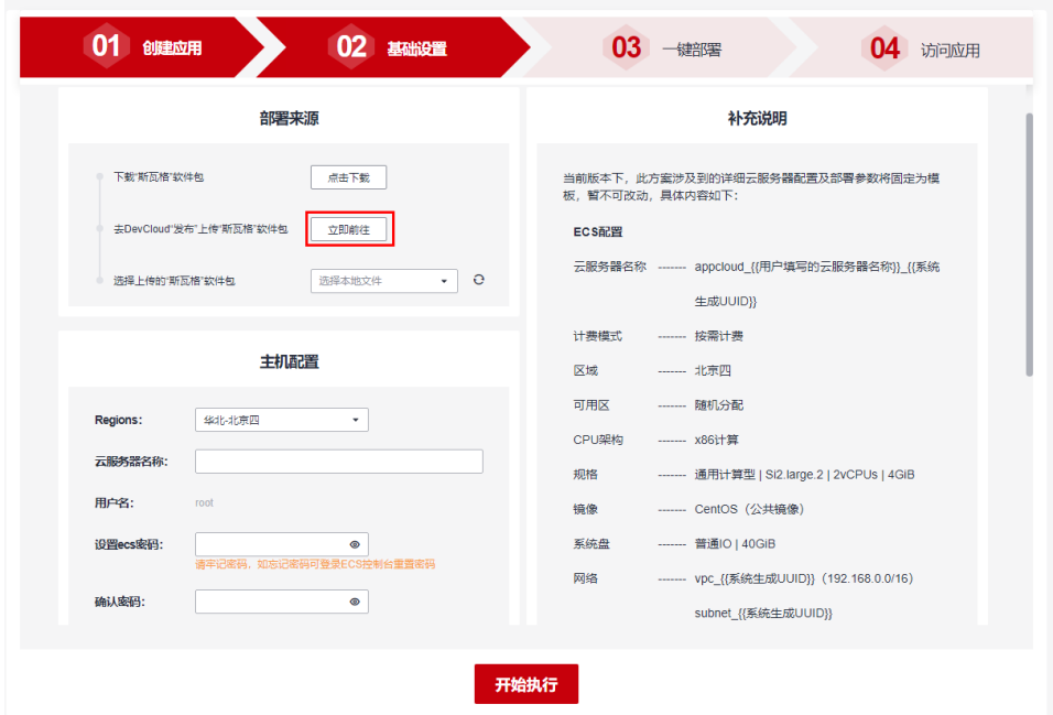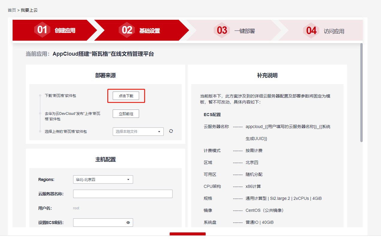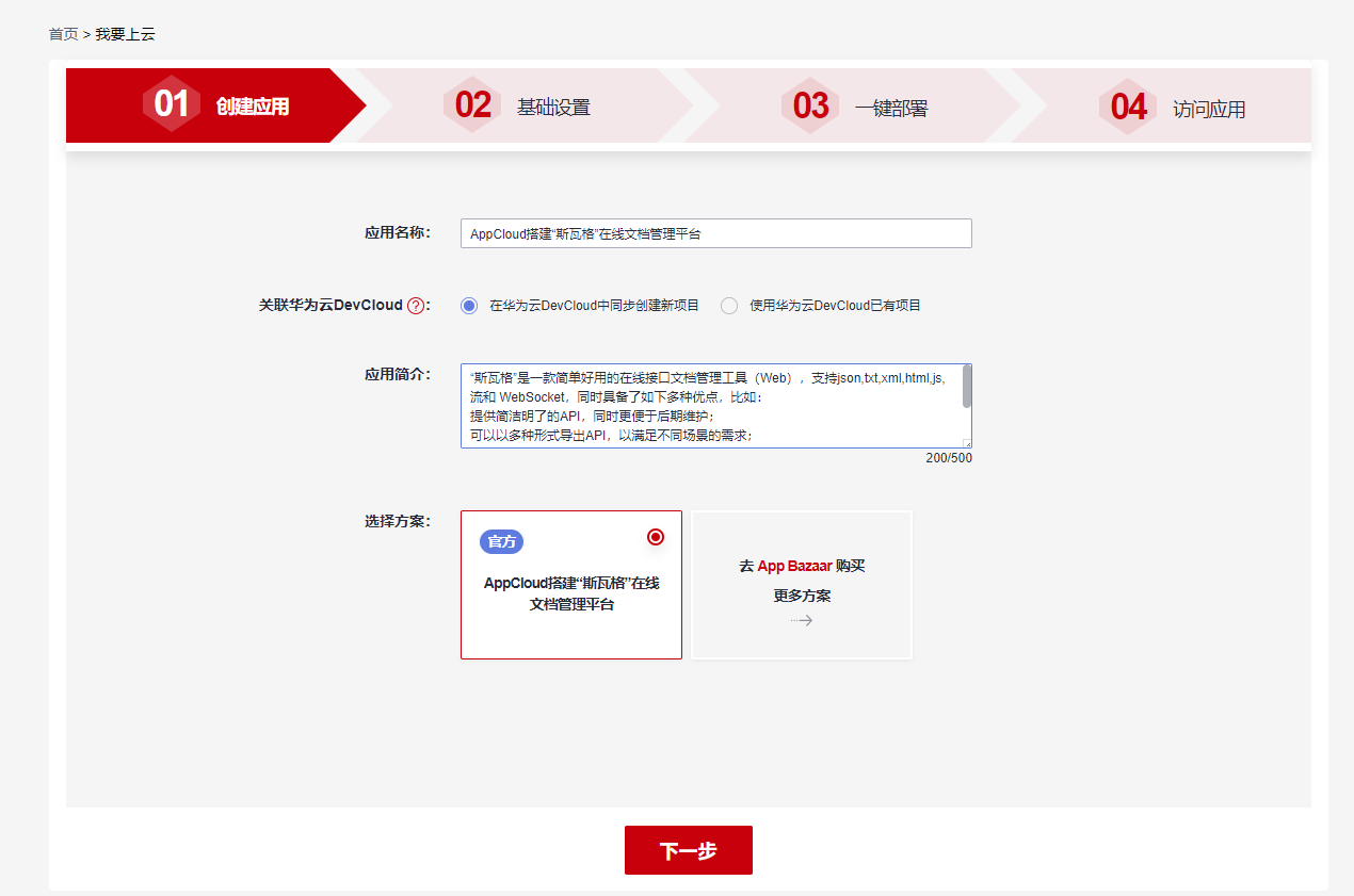项目创建完成后,填写应用简介,并选择官方方案“DevCloud+ECS 搭建‘斯瓦格’在线文档管理平台”,然后点击“下一步”,进行基础设置。