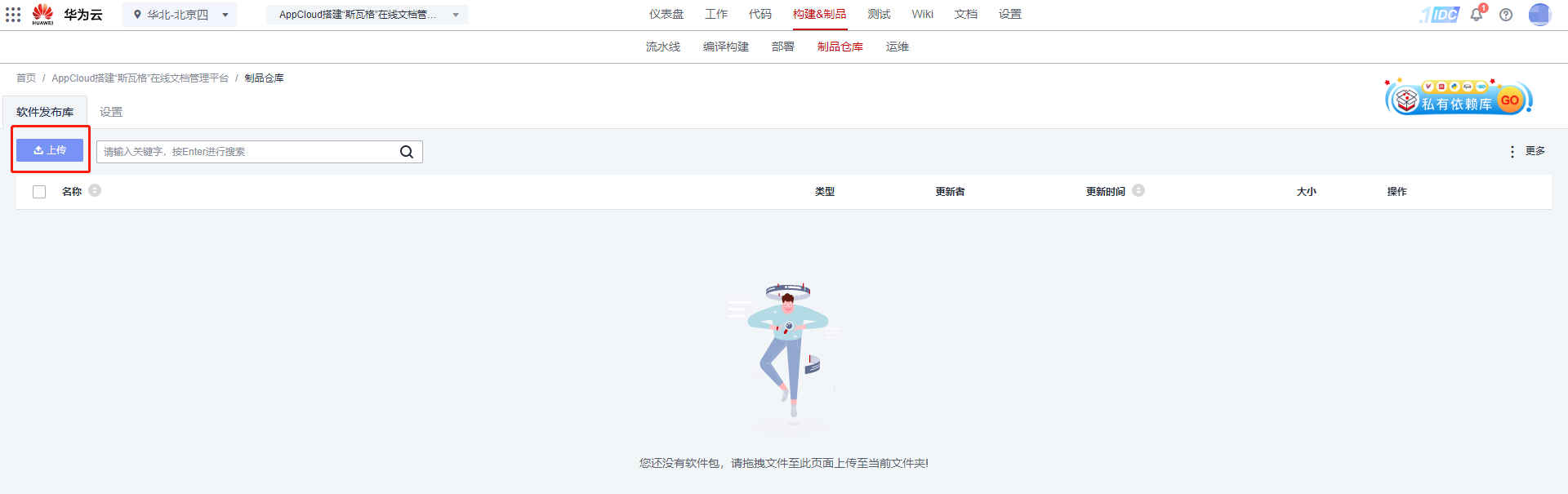 在华为云 DevCloud 中按“构建&发布”—“发布”,进入发布服务,点击“上传”,将下载的“siwage2.1.5.war”上传至发布仓库,供部署阶段使用。
