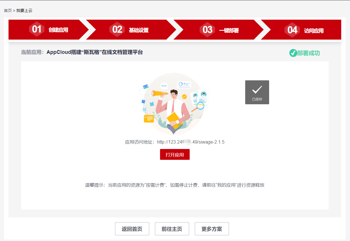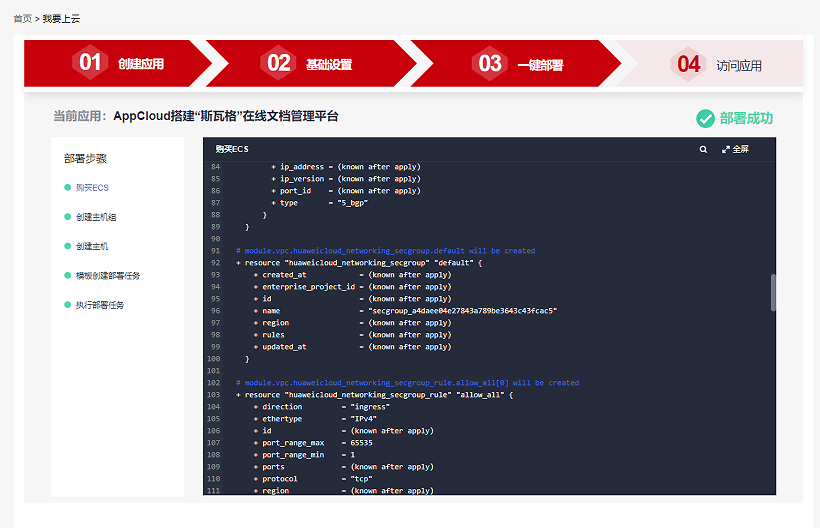 出现“部署成功”,表示部署任务执行成功,点击“下一步”,访问应用。