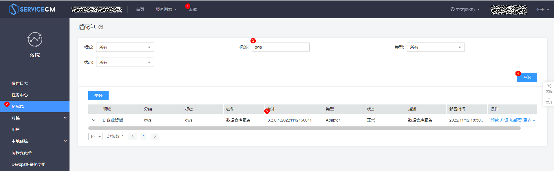 登录servicecm,选择 系统 -> 适配包,标签输入dws,点击查询按钮