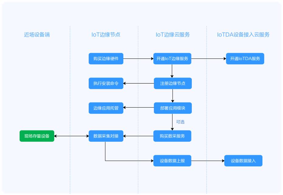 IoT边缘基于物联网平台的设备接入服务,给您提供边缘侧设备接入、低时延业务联动和本地闭环管理的解决方案。使用IoT边缘服务的关键流程如下: