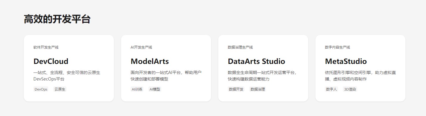 在官网首页的第一楼层,围绕具体的开发场景,展示了华为云的四大生产线, 生产线支持应用、数据、AI模型和数字内容的协同开发、按需编排,让应用开发者、数据工程师、AI科学家们工作在同一平台,共享研发能力和资产,提升多团队的协同效率,更快地构建现代化应用。