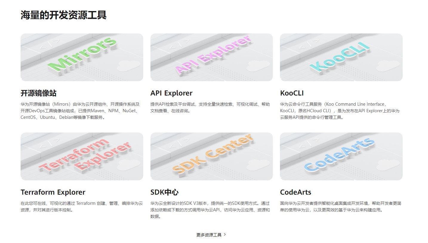 同时,华为云开发者官网围绕开发全流程提供丰富的工具与资源,从开发环境、API调试到云资源的编排管理,让开发者更高效的接入华为云生态,管理华为云资源,基于华为云构建应用,快速实现应用的创新。