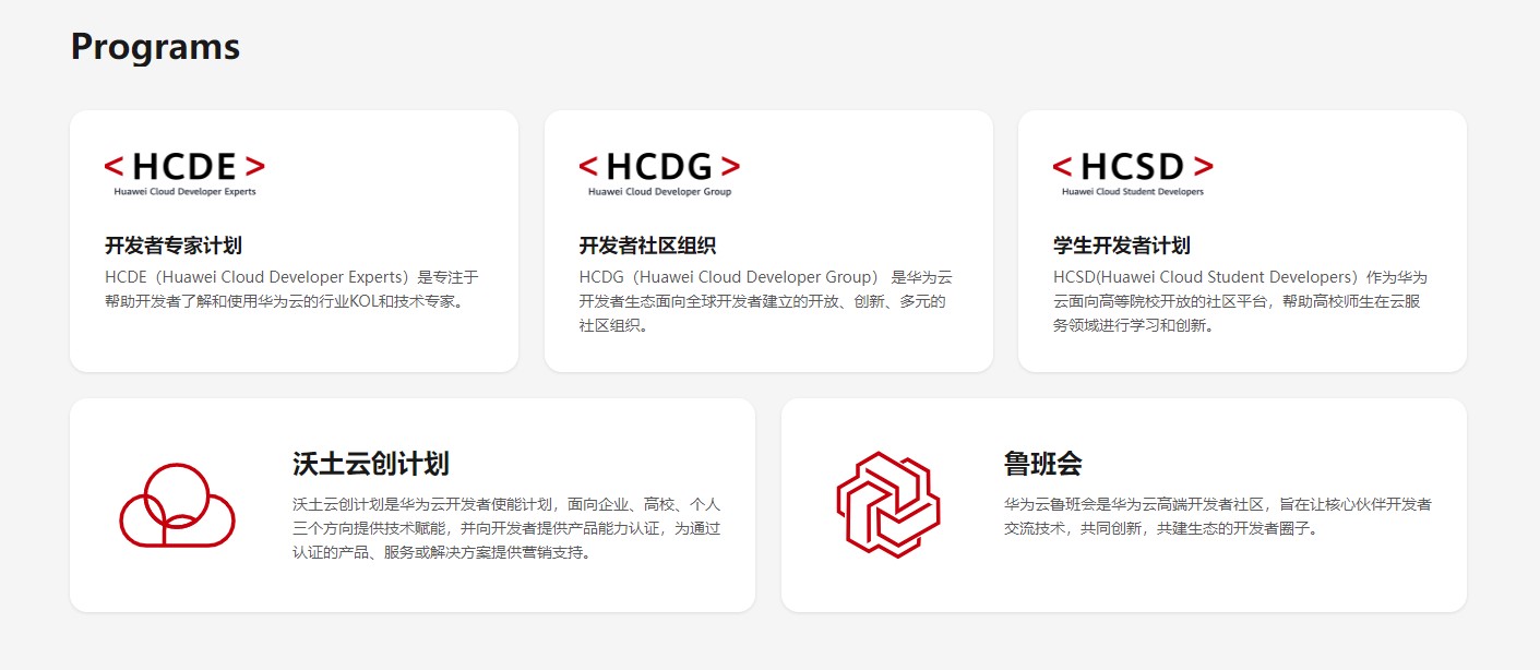 华为云开发者官网呈现了覆盖多圈层、多生态的的Programs(开发者计划),商务圈、专家圈、城市圈和高校圈等不同圈层的开发者,都可以在华为云开放多元的圈层组织里共同创新和成长,推动开发者生态成熟发展。