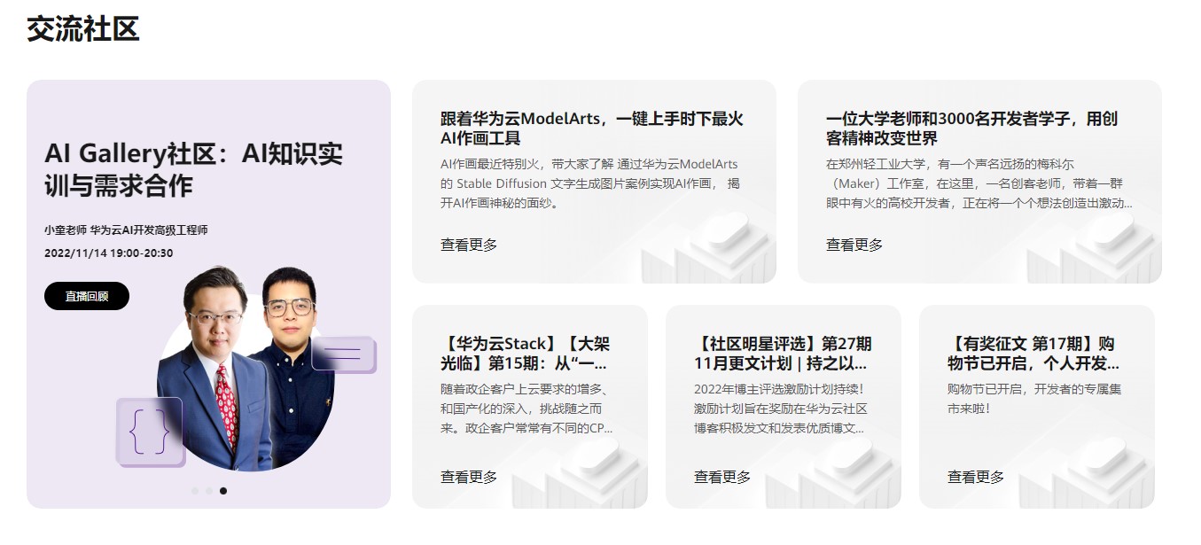 在交流社区版块,汇聚了华为云专家的技术直播、优质干货、精彩的赛事活动等。在这里,开发者可以体验丰富的线上活动、线下沙龙、技能培训,产品实战;便捷地了解华为云产品的最新动态,获取前沿的云知识,与同行们交流,提升能力。