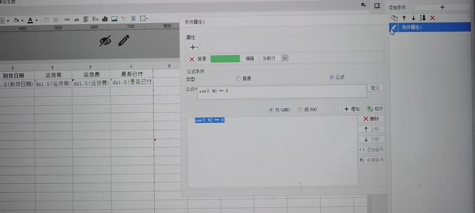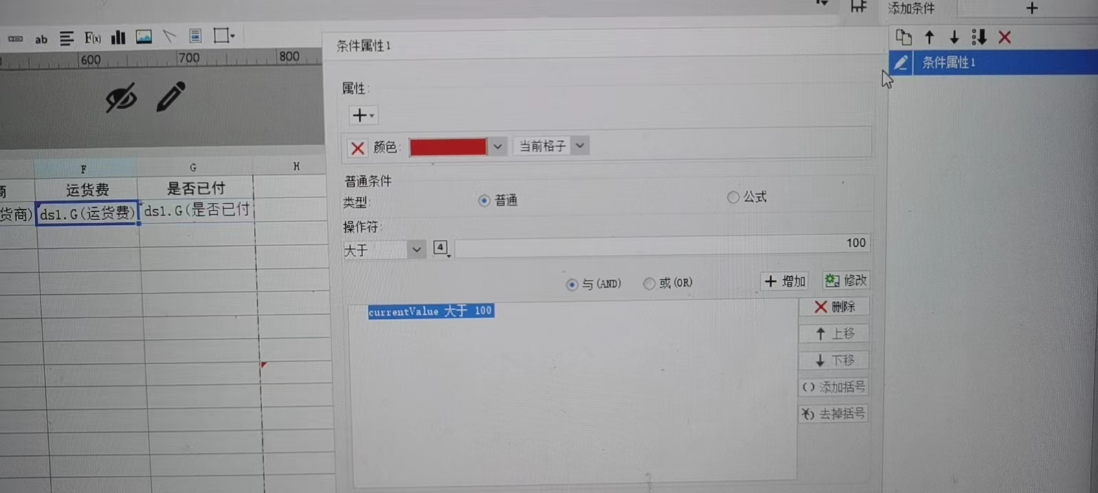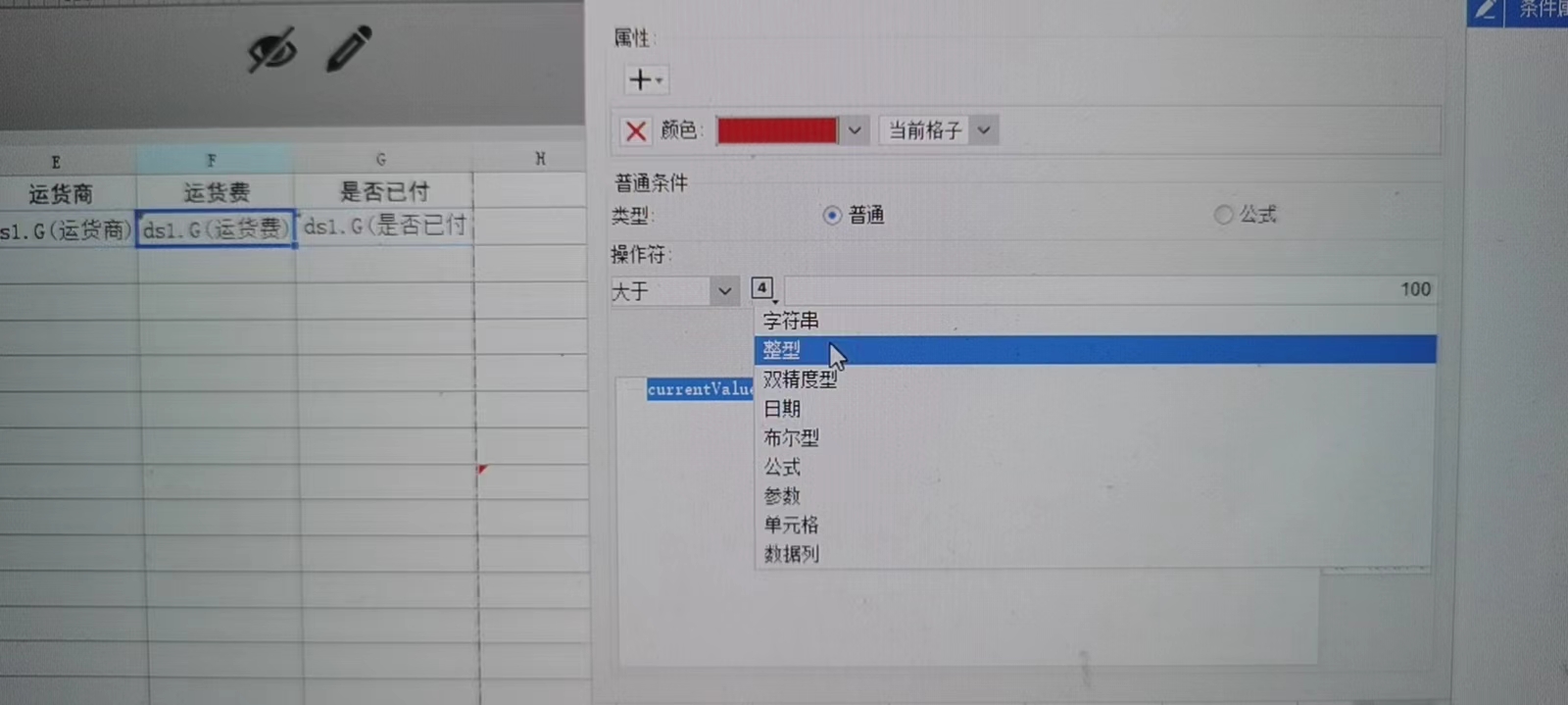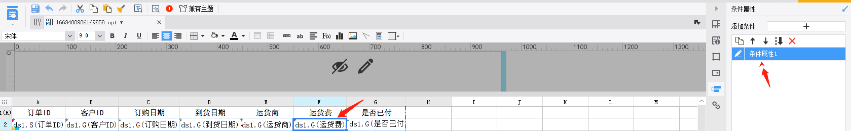 点击 F2 运货费 单元格,再点击 右边5个按钮中第四个 条件属性: