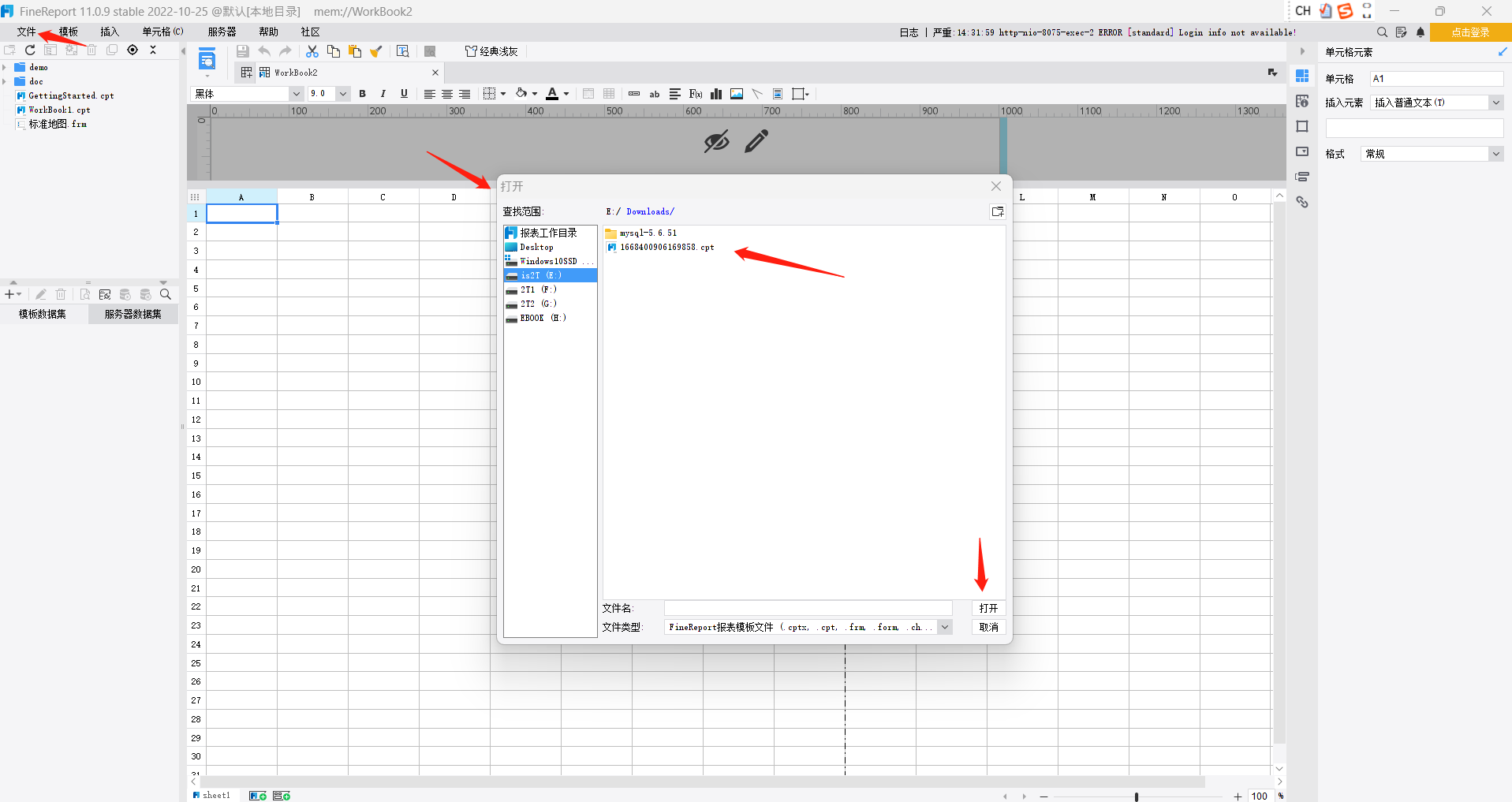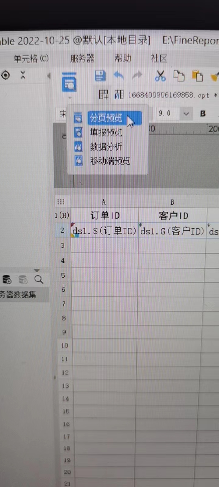 使用FineReport设计器打开这个cpt文件:点击菜单 文件中的关闭,再点击打开。。。