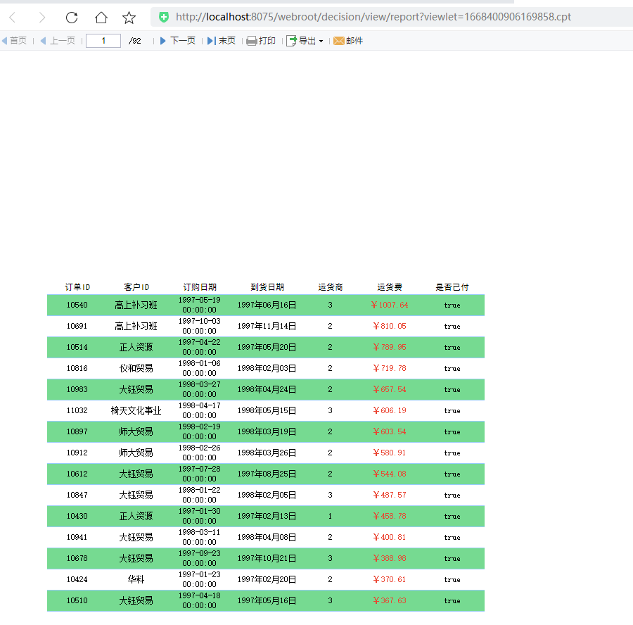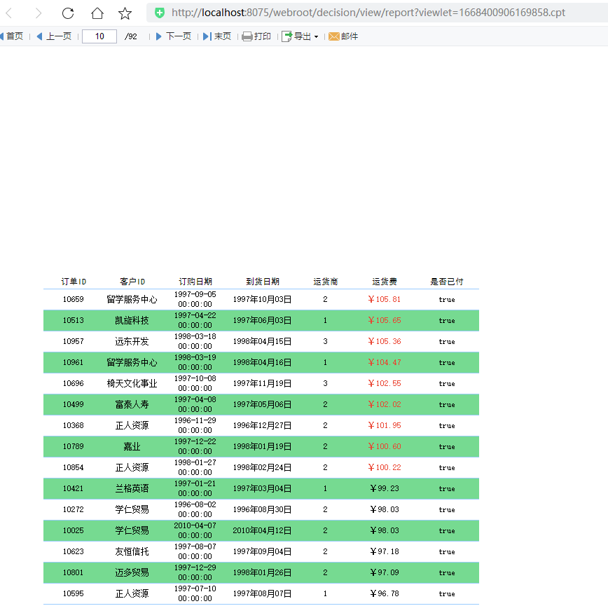 可以看到,数据被分成了92页,其中都是按运费降序排列,而偶数行都是蓝色,超过100运费的都是红色的运费显示。