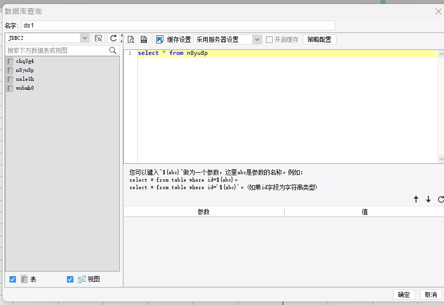 3)使用新建的数据连接,创建数据集,数据集命名为ds1,SQL语句为:select * from n8yu8p