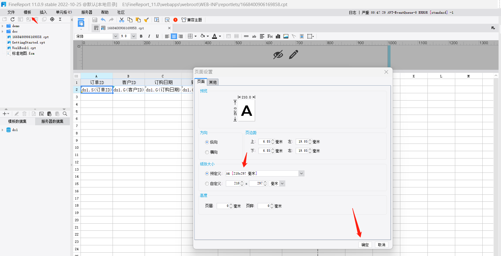 4)将报表的纸张大小设置为A4