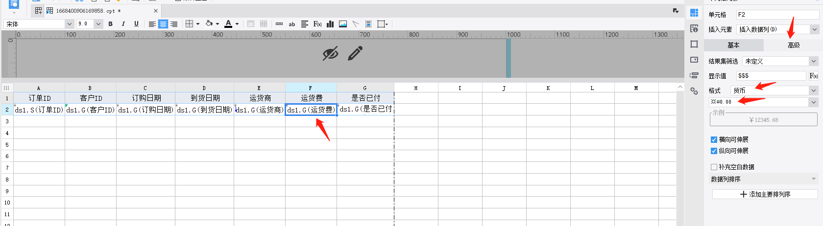 点击 F2 运货费 单元格,再点击 右边5个按钮中第一个 单元格元素,再点击高级,然后在格式中选择货币,按下图方式显示(其实好像不用改,那个cpt文件已经设置好了)