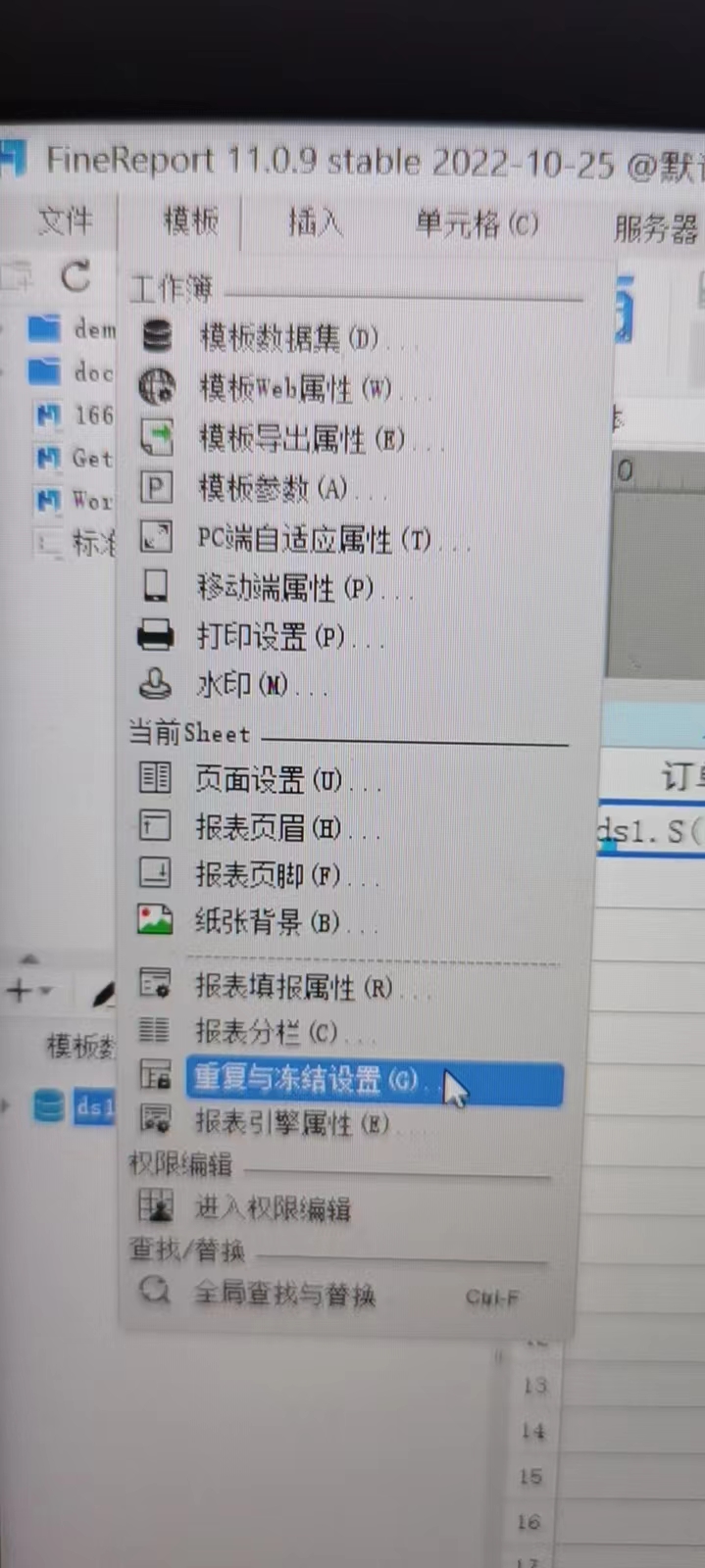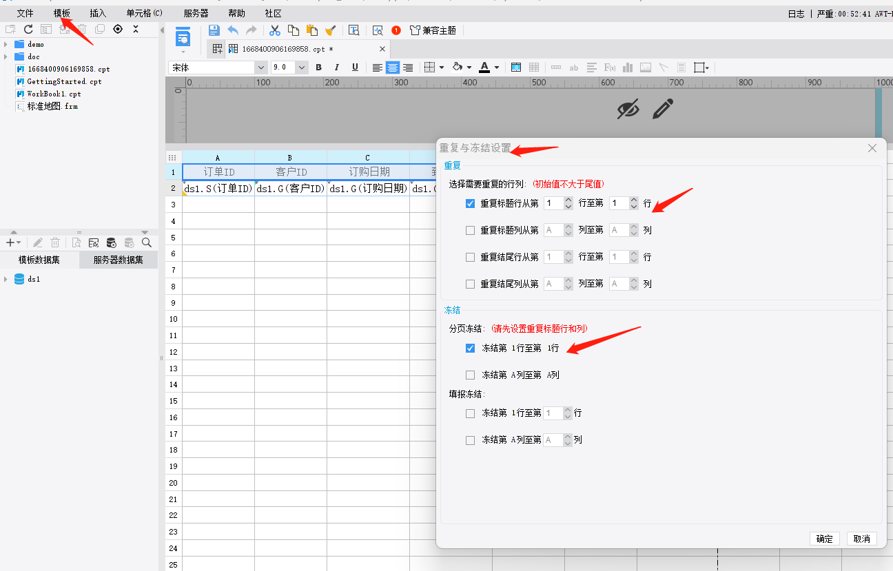在菜单 模板 中选择 重复与冻结设置: