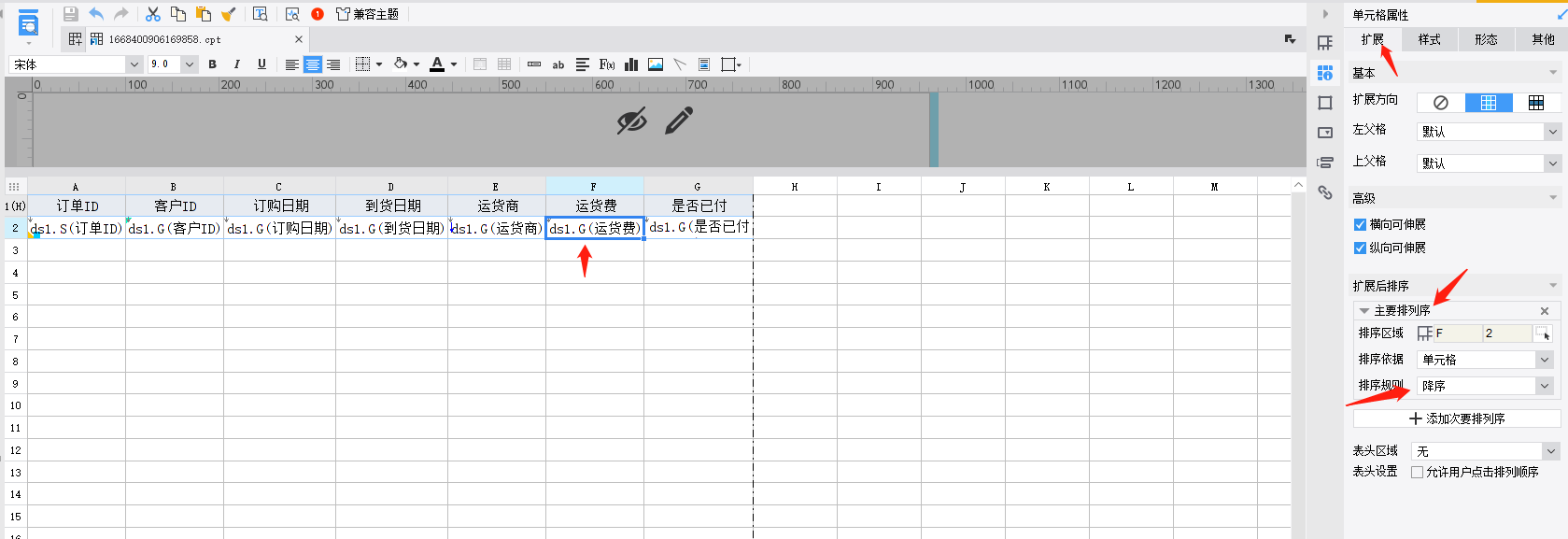 点击 F2 运货费 单元格,再点击 右边5个按钮中第二个 单元格属性,再点击 扩展,增加主要排列序,按以下内容填写: