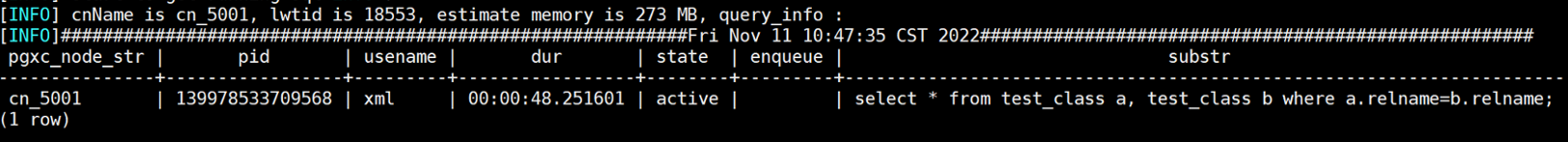 当前sql是在cn_5001上下发的,线程id是18553,估算内存为273MB,sql的信息有pid(线程id),usename(用户名称),dur(执行时间),state(执行状态),enqueue(排队状态),substr(执行的sql)