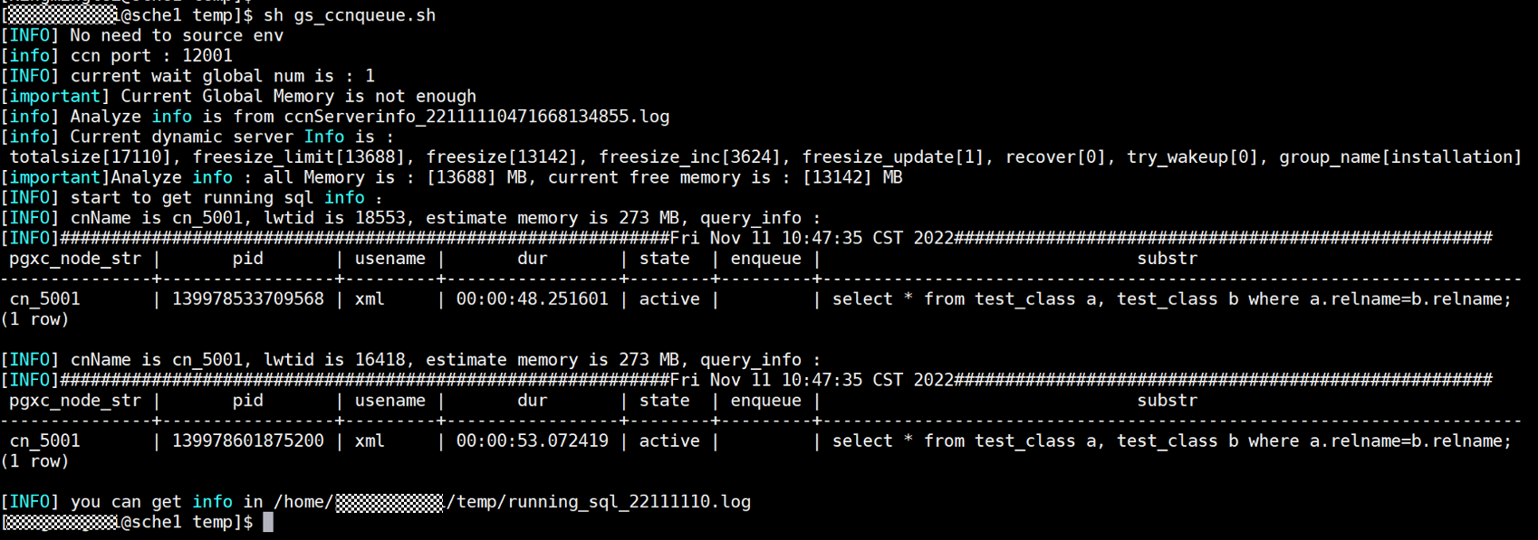 找一个目录执行脚本gs_ccnqueue.sh, 输出结果如下图所示: